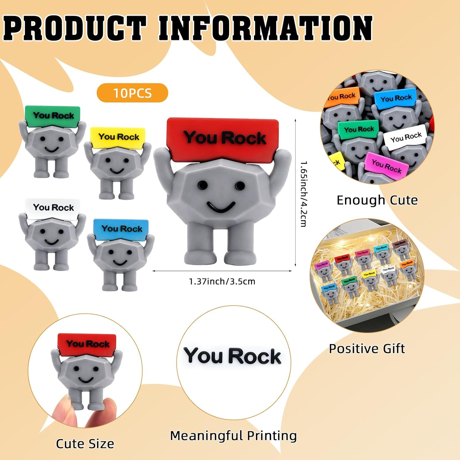 Specifications of You Rock Mini Figures Material: High-Quality Rubber Package Includes: 10-Piece Set Weight per Figurine: Approx. 12g Product Features of You Rock Mini Figures You Rock Mini Figurines Uplifting And Emotional Support: Crafted from high-quality safe rubber, each mini figurine is designed with an inspirational you rock message, offering daily encouragement, emotional comfort, and positive reinforcement in times of need You Rock Mini Figurines Versatile Motivational Gift: Its universal design makes it a perfect gift for various occasions including employee recognition, graduation celebrations, birthday presents, and team awards, serving as a constant reminder of appreciation and support Application Scenarios of You Rock Mini Figures Employee appreciation gifts and corporate recognition Personal motivation and desk decoration Special occasions including graduations, birthdays, and parties Daily encouragement for friends, family, and colleagues Friendly Reminder of You Rock Mini Figures While the figurines are durable, please avoid excessive bending or stretching to maintain their shape and printed message clarity
