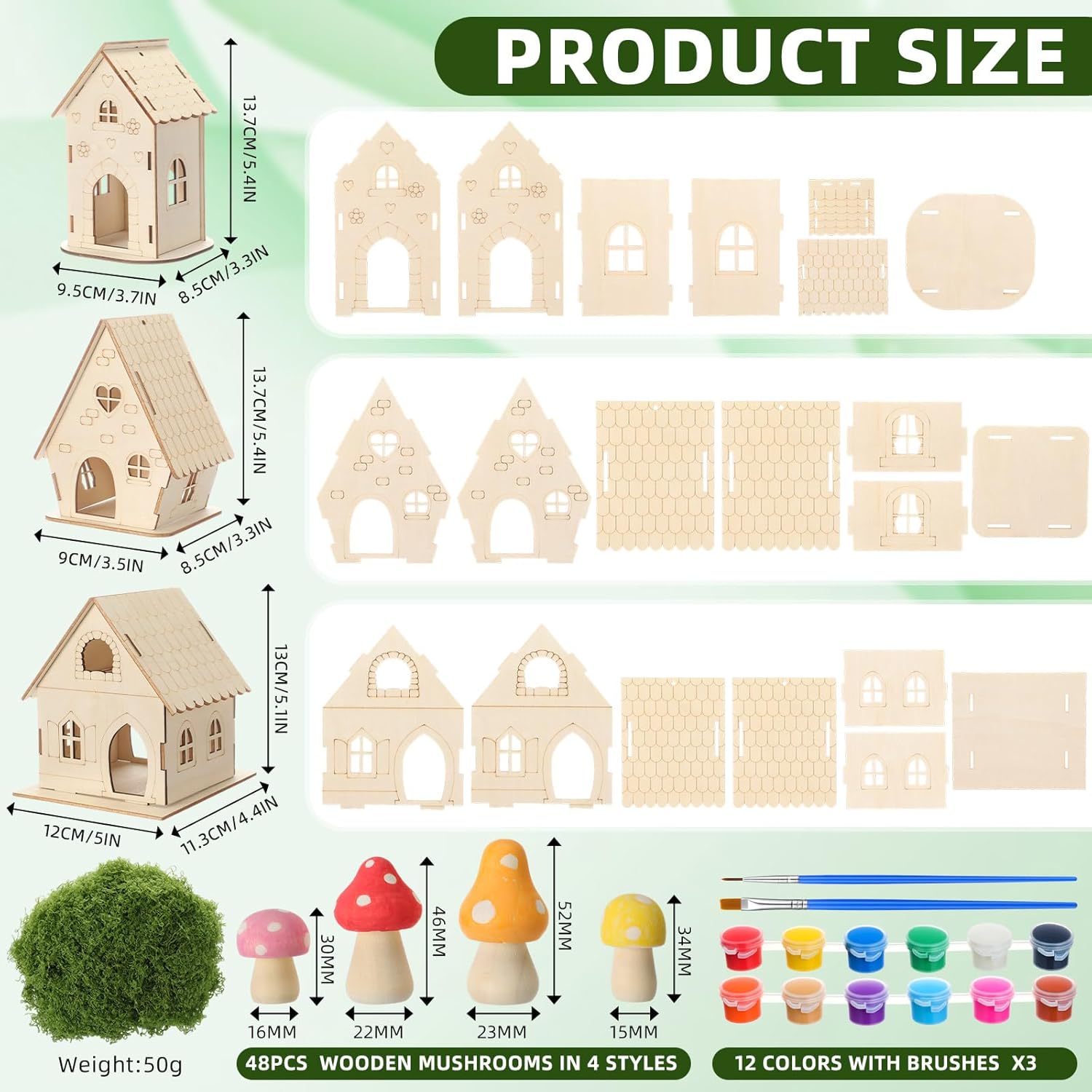 | Included Components | 12 fairy houses (3 mixed cute roof styles), 48 wooden mushrooms, 3 sets of 12-color acrylic paints, 3 sets of brushes, 1 large bag of artificial moss |