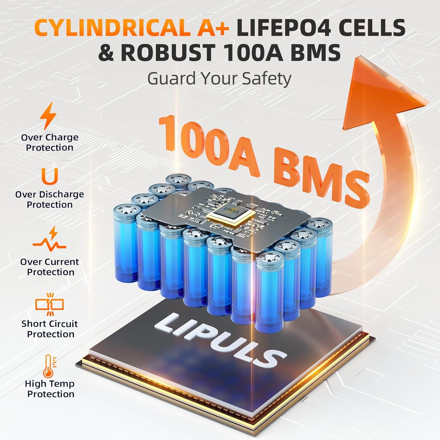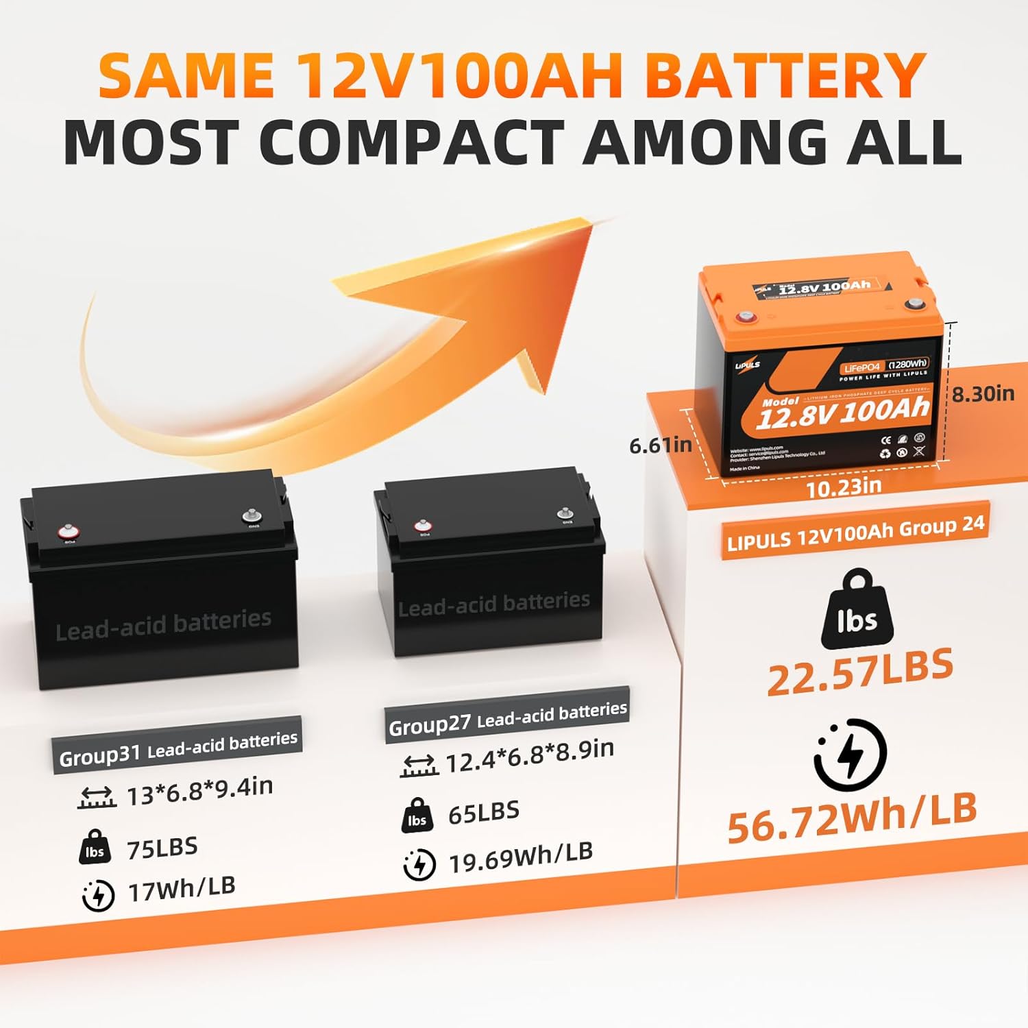 | Included Components | 1* LIPULS 12.8V100Ah-G24-NEW LiFePO4 Battery, 1* Product Manual, 1* Warranty Card, 2* M8 Terminals |