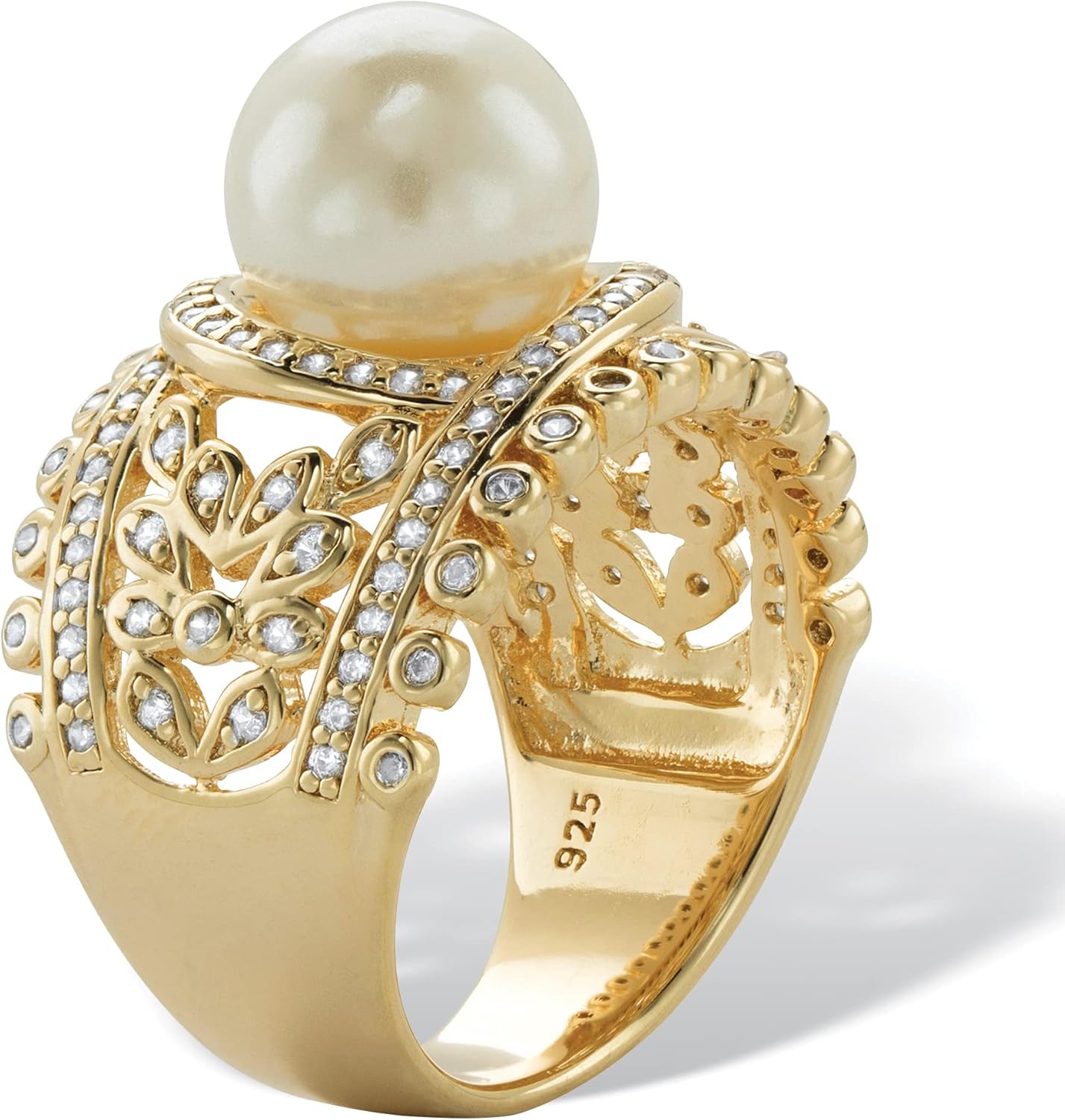 Blooming with subtle style, this impressive cocktail ring draws the eye with a single round pearl, set in a floral web of 14k gold over sterling silver. Glittering cubic zirconia accents create a halo effect around the pearl, and are set inside the flower petals and along the outer edges of the band. .65 carat T.W. Simulated pearl. Sizes 6-10. - 61684