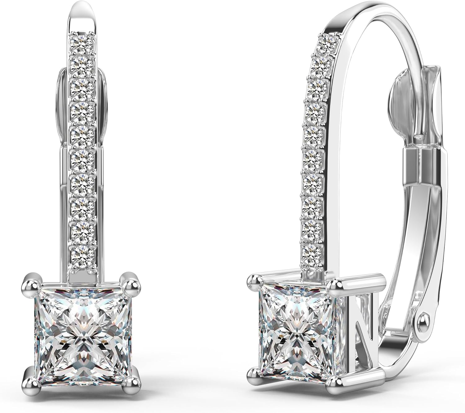 Introducing our exquisite collection of Leverback Earrings! Elevate your style and make a dazzling statement with these 18K White Gold Plated Princess Cut Cubic Zirconia Drop Leverback Earrings. Crafted with utmost precision, these earrings are the epitome of elegance and sophistication. These Leverback Earrings are made with high-quality materials to ensure durability and long-lasting shine. The 18K white gold plating gives these earrings a luxurious look that will enhance any outfit. The princess cut cubic zirconia stones beautifully capture the light, creating a mesmerizing sparkle that will leave everyone in awe. Designed to perfection, these earrings feature a unique square shape, adding a modern touch to the classic design. The sterling silver base ensures a sturdy foundation, while the leverback closure provides extra security, so you can wear these earrings with confidence all day long. Not only are these earrings visually stunning, but they are also incredibly comfortable to wear. Crafted with hypoallergenic materials, they are perfect for those with sensitive skin. You can enjoy these earrings without any worries of irritation or discomfort. These Leverback Earrings are versatile and suitable for various occasions. Whether you're heading to a formal event, a romantic dinner, or simply want to add a touch of elegance to your everyday style, these earrings are the perfect choice. They will effortlessly complement any outfit, from casual to glamorous, making you feel like a true fashionista. The cubic zirconia stones used in these earrings are a fantastic alternative to diamonds. With their high clarity and brilliance, they closely resemble genuine diamonds, offering you a luxurious look without the hefty price tag. The square design and dangle style make these earrings a true statement piece, sure to attract compliments wherever you go.