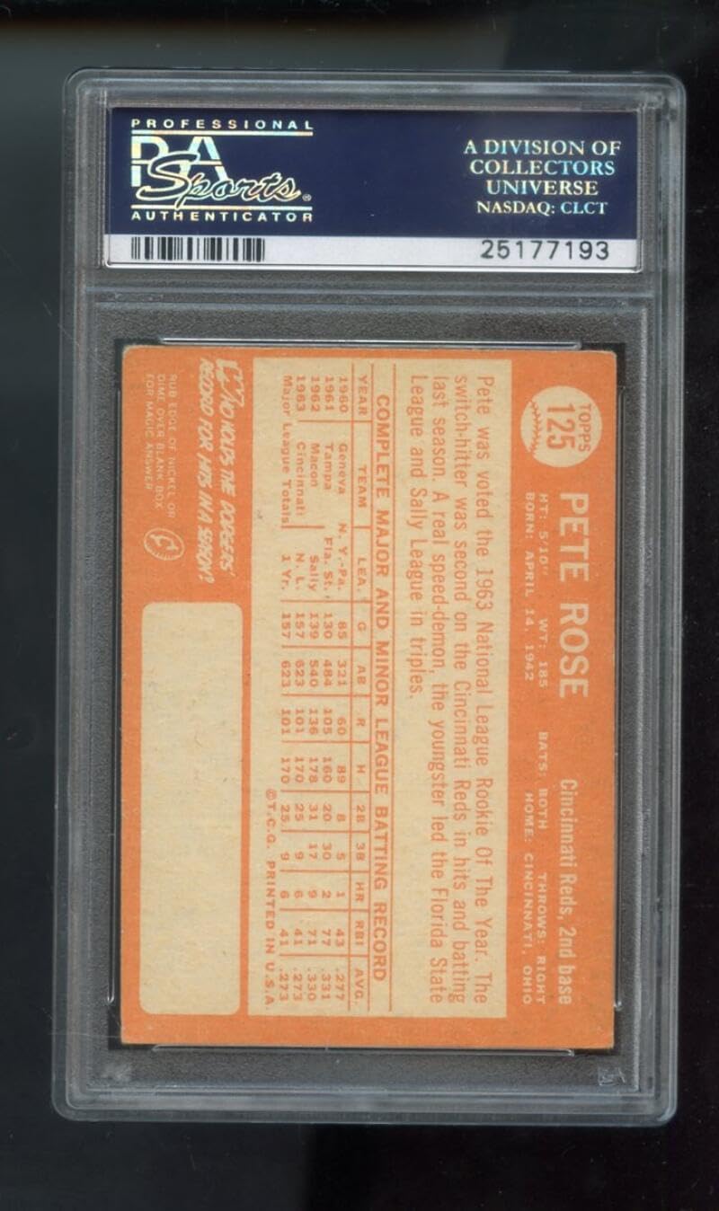 1964 Topps #125 Pete Rose All-Star Rookie Reds PSA 4 Graded Baseball Card MLB. This listing is for a 1964 Topps #125 Pete Rose All-Star Rookie Reds Graded Baseball Card graded by PSA as a PSA VG-EX 4. The card is shown in the first scan. The back of the card is shown in the second scan. Five cards are shown in the second scan, but only the one card described in the title and shown in the first scan is included. Match the PSA serial number of the card in the first scan to that in the second scan to determine which back corresponds to the card listed. Great card!