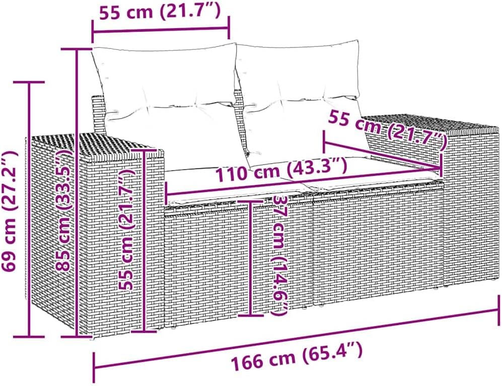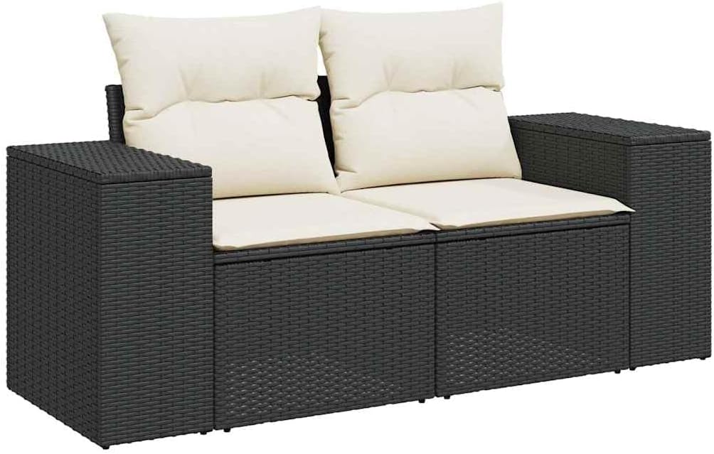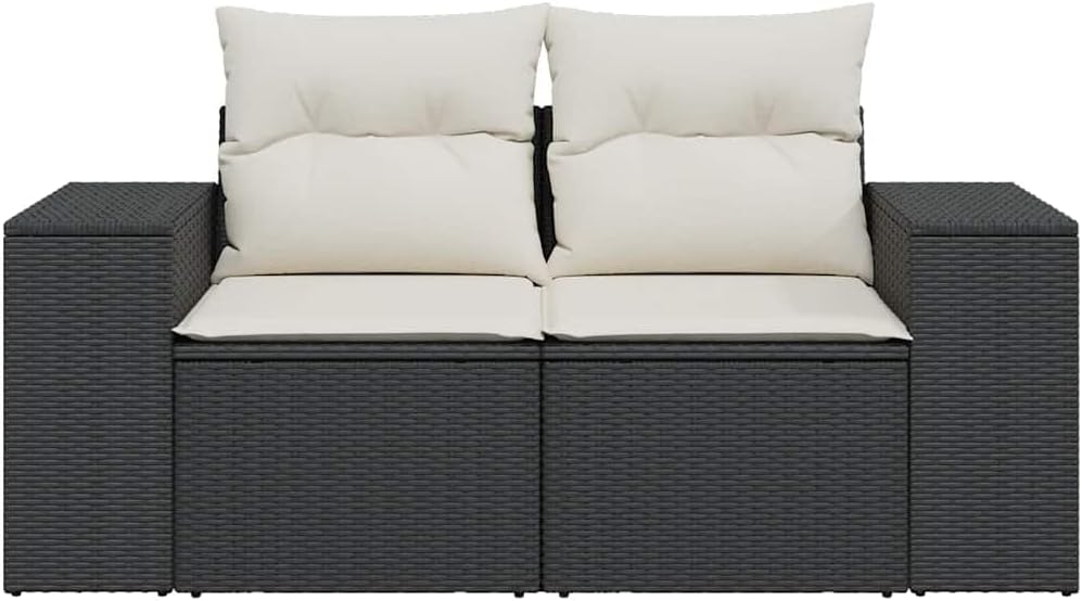 This modern 2-seater garden sofa is the go-to for outdoor seating that looks fab and works well. Built with sturdy poly rattan and a tough powder-coated steel frame, it’sfor relaxing on patios, balconies, or in gardens, giving you a stylish spot to unwind in nature.Modular Configuration: Change up the sofa into different shapes, so it fits any outdoor space.UV and Water : Made with quality UV- poly rattan, it’s built to handle sunlight without damage and is water- for those unpredictable rainy days.Comfortable Cushions: The soft polyester cushions provide excellent support and comfort,for long chats or peaceful afternoons.Stylish Charm: Its sleek black frame with cream white cushions adds a modern touch to your outdoor area, making it a standout piece in any garden or patio.Easy Maintenance: The removable cushion covers are a breeze to clean, keeping your sofa looking fresh and inviting for years.Color: BlackShape: RectangularMaterial: Synthetic Poly RattanFinish: Powder-CoatedIndoor/Outdoor: Indoor / OutdoorCover Included: YesRoom: Garden and terraceMaximum Number of People: 2Maximum Weit: 485 lbsDimensions: 24.4 x 73.2 x 27.2 in (W x L x H)Weight: 40.12 lbsSeat Depth: 21.7 inSeating Capacity: 2Swings: NoDelivery Contains: 2 x Corner seatAssembly Required: YesRecommended Number of People for Assembly: 2