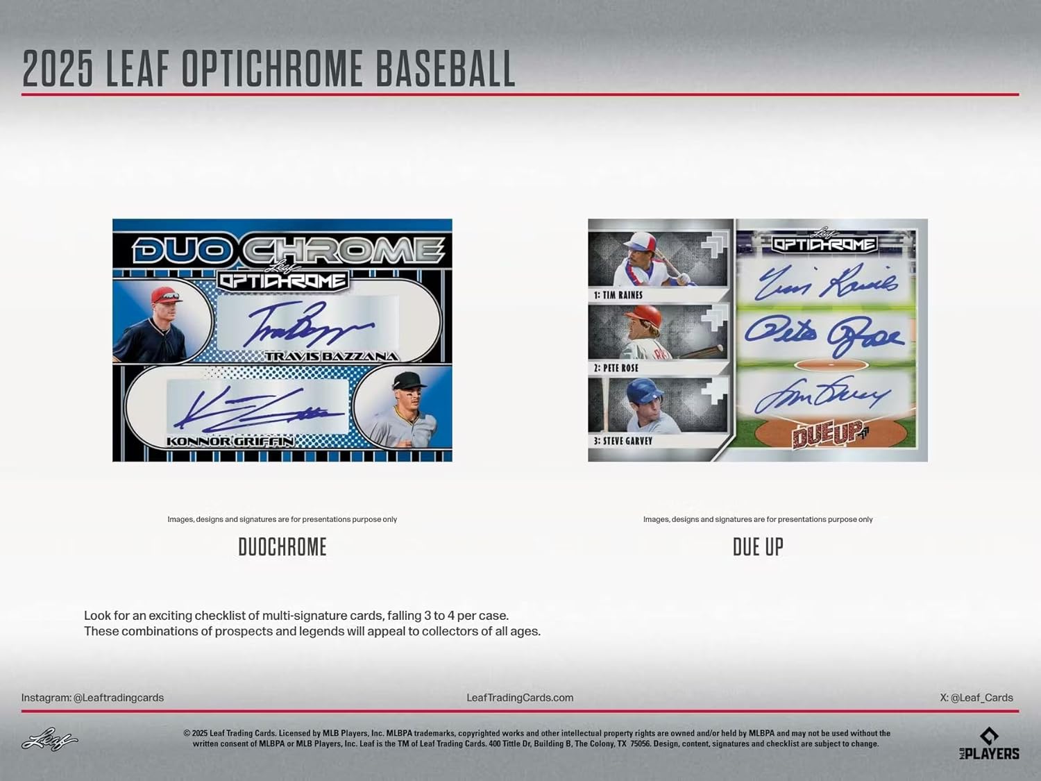 2025 Leaf Optichrome Baseball Hobby BoxEach Box contains 6 Autographs, on average!Leaf Trading Cards is proud to introduce 2025 Leaf Optichrome Baseball, a brand new addition to the Leaf Baseball product portfolio! Showcasing Leaf's patented metal technology, this release features a full spectrum of baseball talent from the past, present, and future.Collectors can expect stunning designs, low-numbered inserts, parallels, and high-end chase throughout the product. Look for the extremely rare Glow Base and Glow Autograph versions.New to Optichrome Baseball: memorabilia cards! This release includes an incredible lineup of signed legends, top prospects, and game-used memorabilia cards featuring some of baseball's greatest icons, including Lou Gehrig, Babe Ruth, Mickey Mantle, Ted Williams, Willie Mays, and more.Look for an exciting checklist of multi-signature cards, falling 3 to 4 per case. These combinations of prospects and legends will appeal to collectors of all ages.The combination of multi-signatures cards will excite baseball card collectors young and old.Also look for double-front 8-signed cards, pairing an impressive lineup of baseball's top young stars and all-time greats.Product Highlights- Find 3 to 4 autographs per box from a strong roster of names, including: Bobby Witt Jr., Jesus Made, Konnor Griffin, Nolan Ryan, Dexter McCleon Jr., Travis Bazzana, and Roch Cholowsky (projected #1 pick in the 2026 Draft).- Look for 3 to 4 Multi-signature cards per case.- Look for Game-used memorabilia cards of: Babe Ruth, Lou Gehrig, Willie Mays, Ted Williams, Mickey Mantle, and many more.Configuration: 8 Cards Per Box