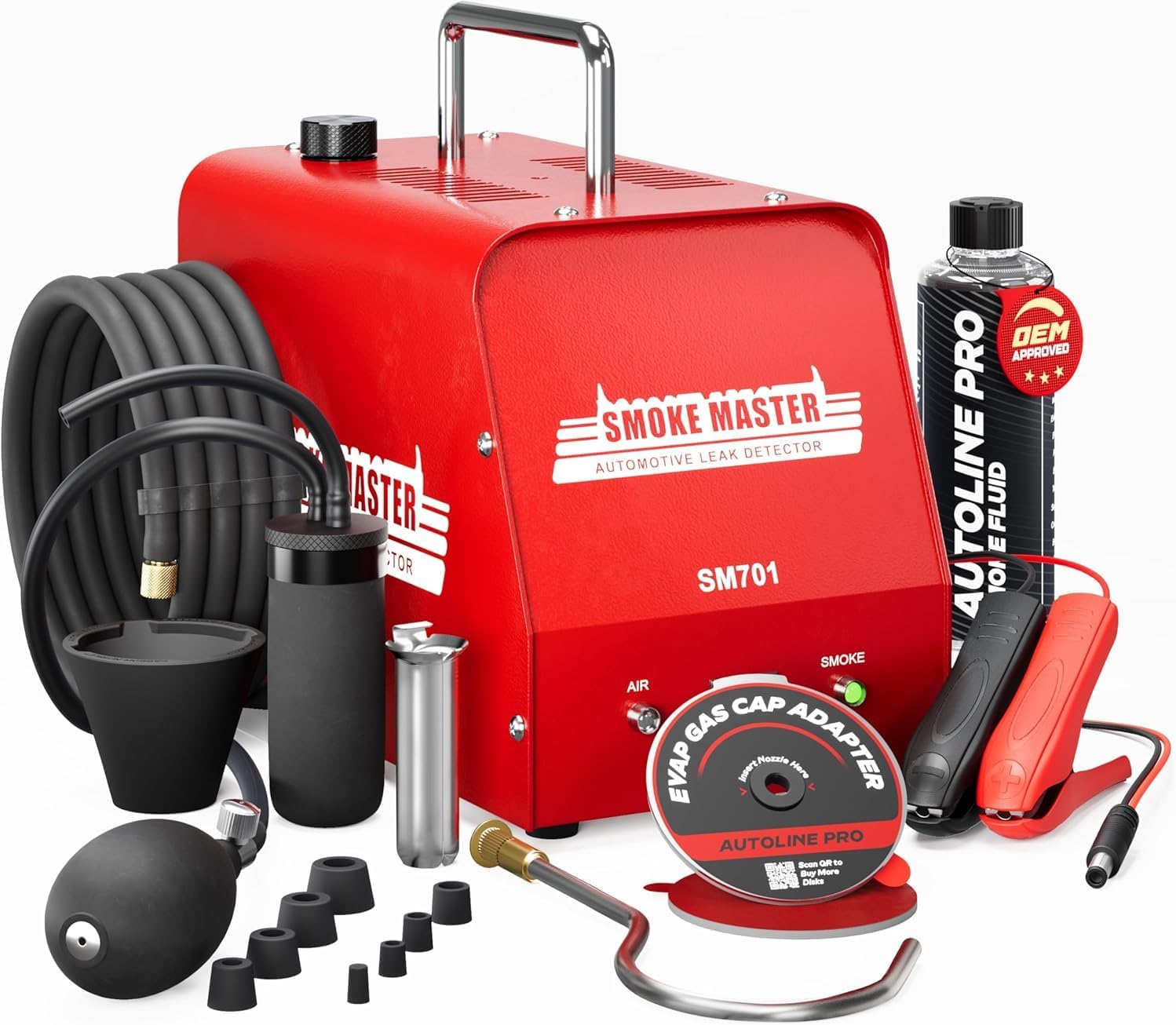 The Automotive Smoke Machine SM701 is designed for detecting leaks in automotive systems such as the EVAP system, intake systems, vacuum lines, and more. The premium ceramic cartridge ensures a durable, high-quality heating element that generates consistent and high volume smoke, making it easier to detect even the smallest leaks.