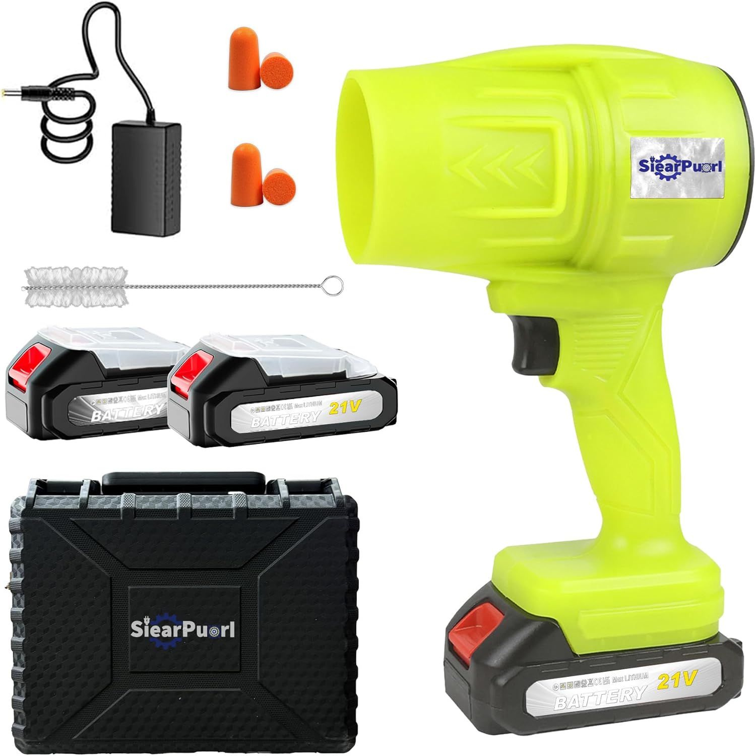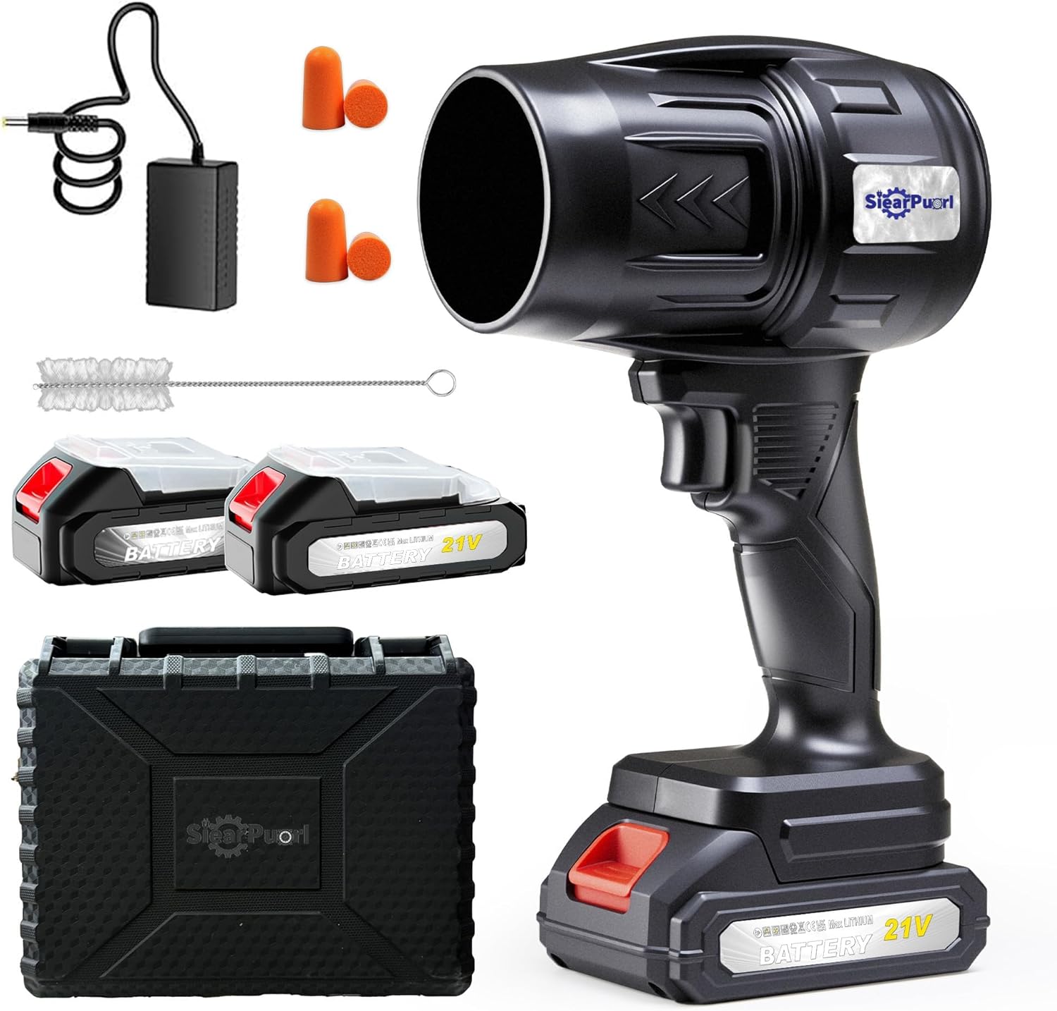The SIEARPUORL turbo jet blower cordless is a compact yet powerful battery powered blower handheld designed for daily cleaning. With a 98,000RPM motor, this turbo blower delivers strong airflow like a bullseye blower, making it easy to handle leaves, dust, and debris. Weighing only 1.7LB, this mini blower is lightweight and easy to use with one hand, perfect as a hand blower cordless for yard, patio, car drying, and indoor cleaning. Compared to a traditional leaf blower, this cordless leaf blower offers better portability and control. Equipped with 2 batteries, this jet blower ensures continuous use across multiple scenarios, making it one of the most practical hand held blowers for home and outdoor use. This SIEARPUORL cordless leaf blower kit includes 2 Pack Batteries (21V 1300mAh) for continuous cleaning and car drying. The complete set features a hard plastic case, 2 batteries with dust covers, a US charger, a cleaning brush, and earplugs to reduce noise. Ready to use out of the box, it is the most versatile turbo jet blower cordless and hand held blowers package available.