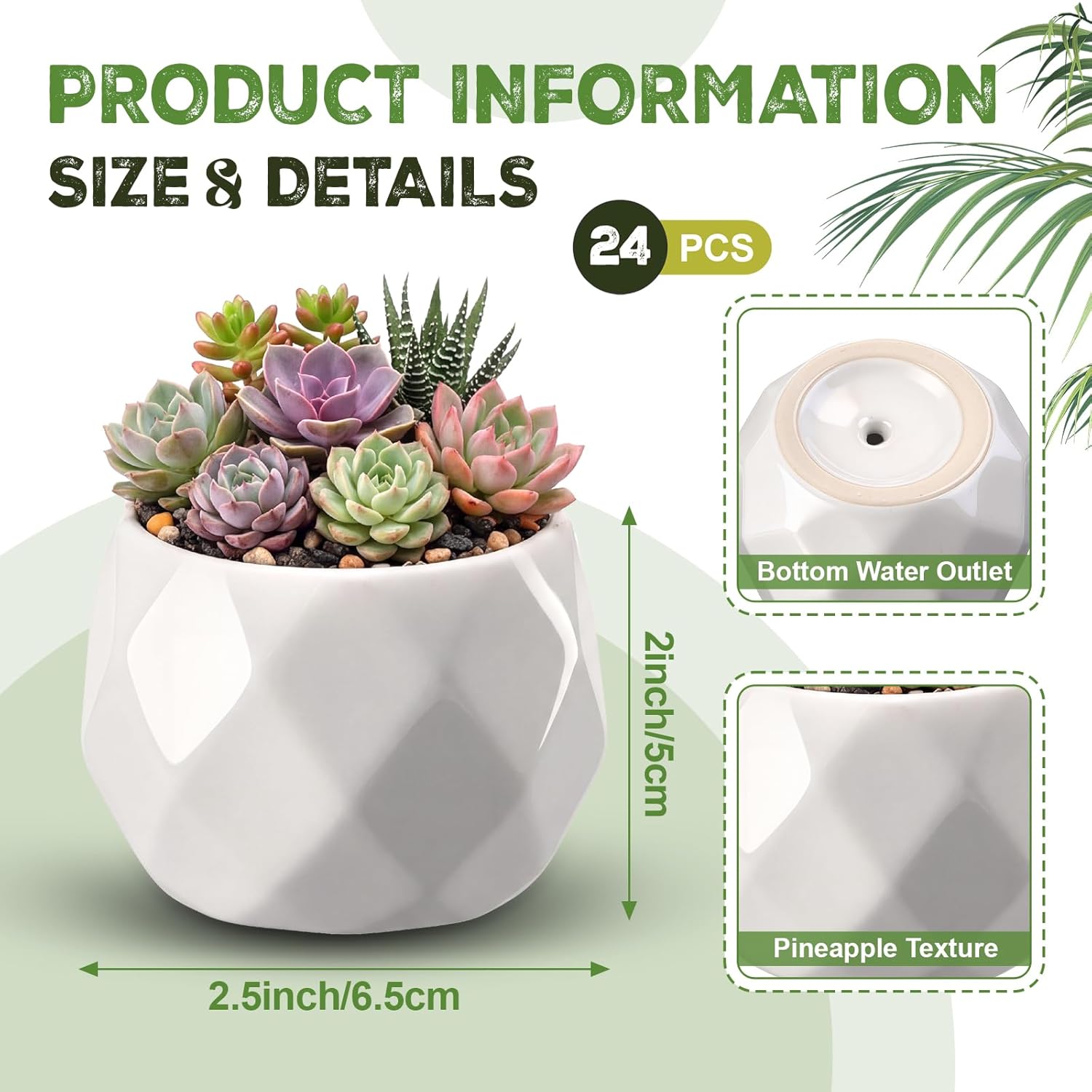 Features: Its compact and stylish white design easily complements various home decor styles, making it an ideal choice for DIY plant arrangements, interior decoration, and creating a fresh and inviting atmosphere. It's also a perfect small and convenient gift option for everyday gardening and decorating. Specifications: Material: ceramic Color: white Size: 2.5 x 2 x 2.7 inches Package includes: 24 x Ceramic pots Notes: Manual measurement, please allow slight errors on size. The color may exist a slight difference due to different screen displays