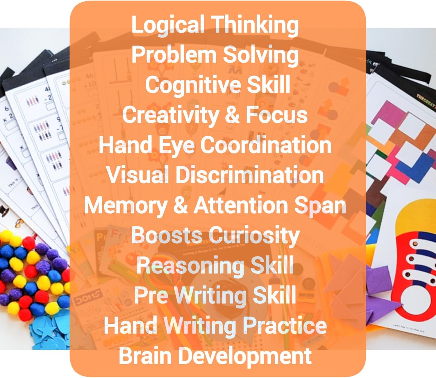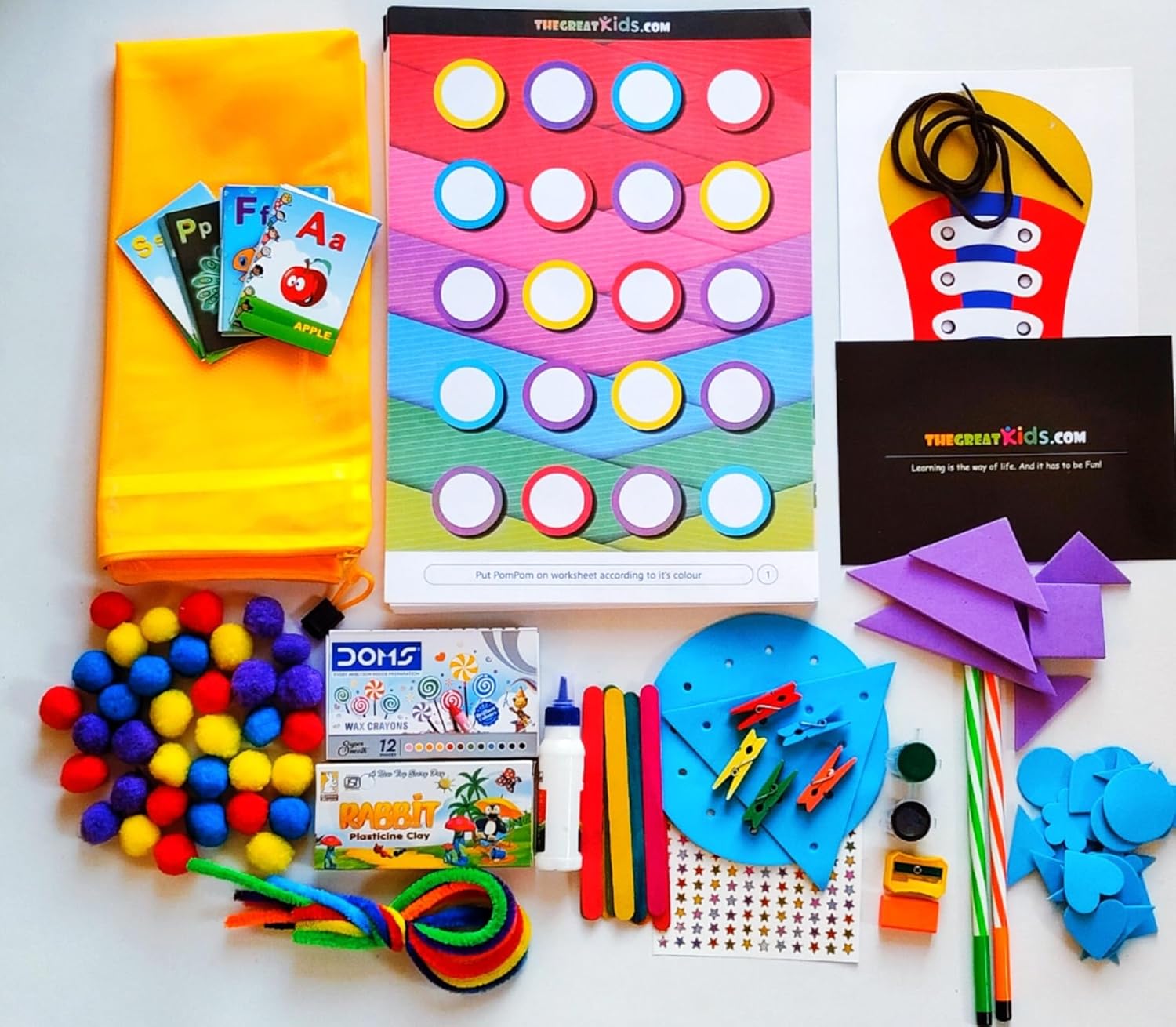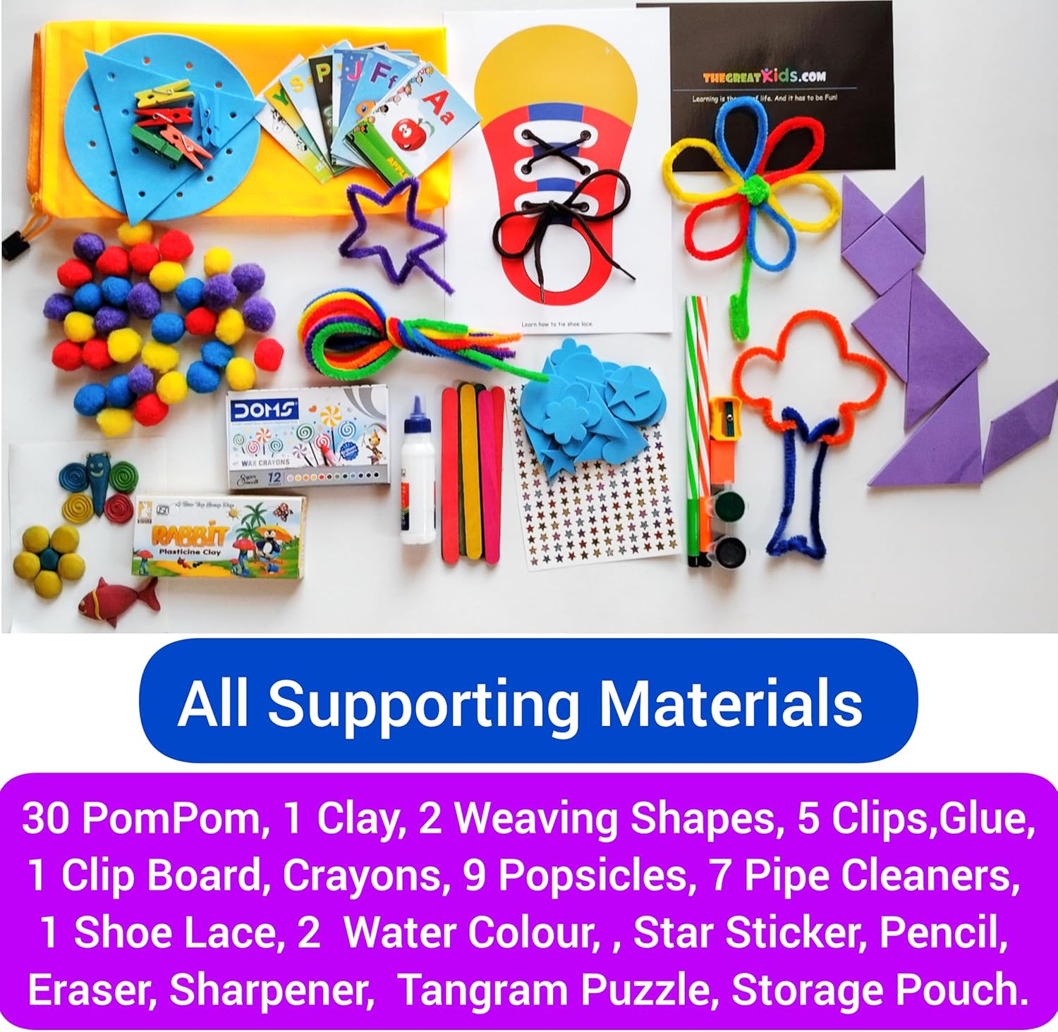 | Included Components | 1 Set of Crayon Colours, Pencil, Sharpener & Eraser, Water Colour, Glue, 1 Shoe Lace, Tangram Puzzle Pieces, Quality Storage Pouch, Star Sticker, 250 Activity Worksheet, (125 Both Side Printed), (A4 Size, 110 GSM Paper), Alphabet Flashcards, Habit & Manner Poster, 5 Clips for Activity, 1 Base Writing Pad, 30 PomPoms, 1 Set of Clay, 2 Weaving Shapes, Shoes Lacing Card, 1 Shoe Lace, All Supporting Materials, 9 Popsicle Sticks, 7 Colourful Pipe Cleaner |