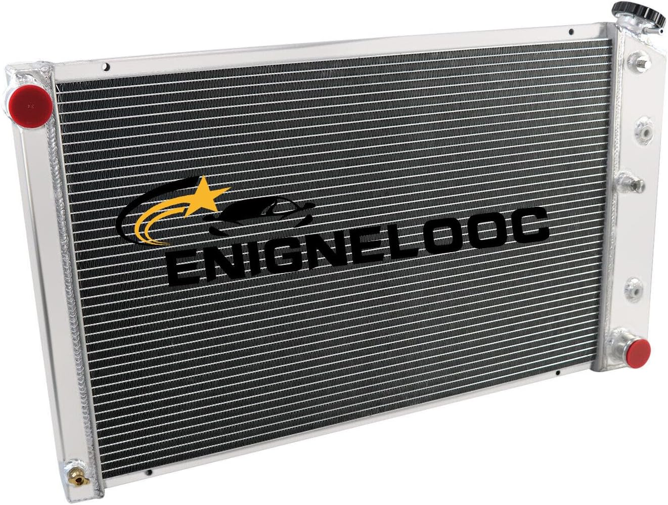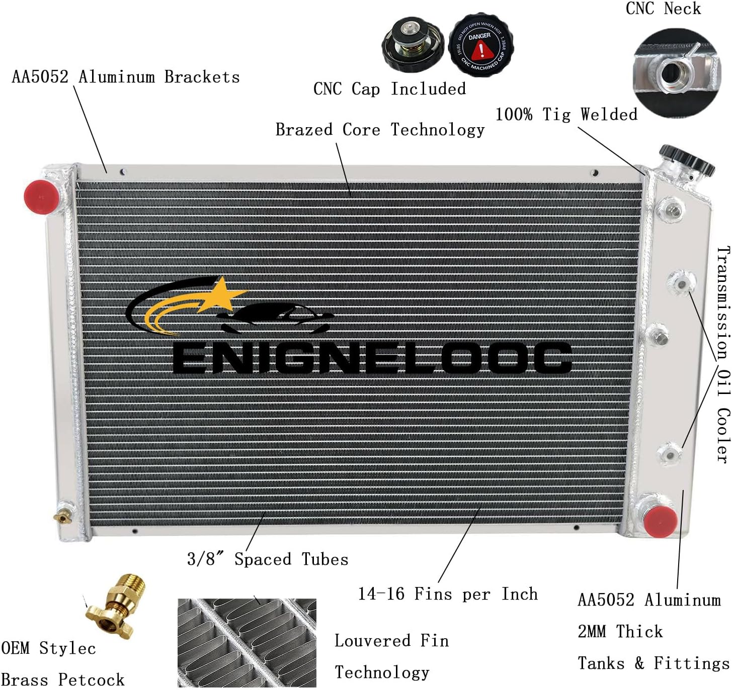 Radiator Size:Condition: NewHigh Performance Racing Spec.3-Row of tubes Core Racing DesignPetock Drain: OEM style brass petcock drainCore Size: 28,26L" x 16,85W" x 1,73T"Overall Size: 33,66L" x 18,50W" x 3,93T"Hose Locations & Sizes: 1,57" / Out Passenger 1,49"Trans Cooler: Included- φ32*215*G1/4(Z)Vehicle Fitment:For Buick Centurion 7.5L 1973For Buick Century 3.8L 1975 1976For Buick Century 5.7L 1973 1974 1975 1976For Buick Century 7.5L 1973 1974For Buick Electra 5.0L 1981 1982 1983 1984For Buick Electra 5.7L 1977 1978 1979 1980 1981For Buick Electra 7.5L 1971 1972 1973 1974 1975 1976For Buick Estate Wagon 5.7L 1973 1977 1978 1979For Buick Estate Wagon 7.5L 1971 1972 1973 1974 1975 1976For Buick LeSabre 3.8L 1976 1977 1978 1979For Buick LeSabre 5.0L 1981 1982 1983 1984 1985 1986 1987 1988 1989 1990For Buick LeSabre 5.7L 1971 1972 1973 1974 1975 1976 1978 1979For Buick LeSabre 7.5L 1971 1972 1973 1974 1975 1976For Buick Reatta 3.8L 1988 1989 1990 1991For Buick Regal 3.8L 1975 1976 1977For Buick Regal 5.7L 1973 1974 1975 1976 1977For Buick Regal 7.5L 1973 1974For Buick Riviera 3.8L 1980 1981 1982 1983 1984 1985For Buick Riviera 4.1L 1981 1982 1983 1984For Buick Riviera 5.0L 1980 1981 1982 1983 1984 1985For Buick Riviera 5.7L 1977 1978 1979 1980For Buick Riviera 7.5L 1971 1972 1973 1974 1975 1976For Buick Skylark 5.7L 1972For Cadillac Calais 7.7L 1968 1969 1970 1971 1972 1973 1974For Cadillac DeVille 7.7L 1970 1971 1972 1973 1974...Package Include:1 X 3-Row AA5052 Aluminum Radiator1 X CNC Machined Radiator Cap