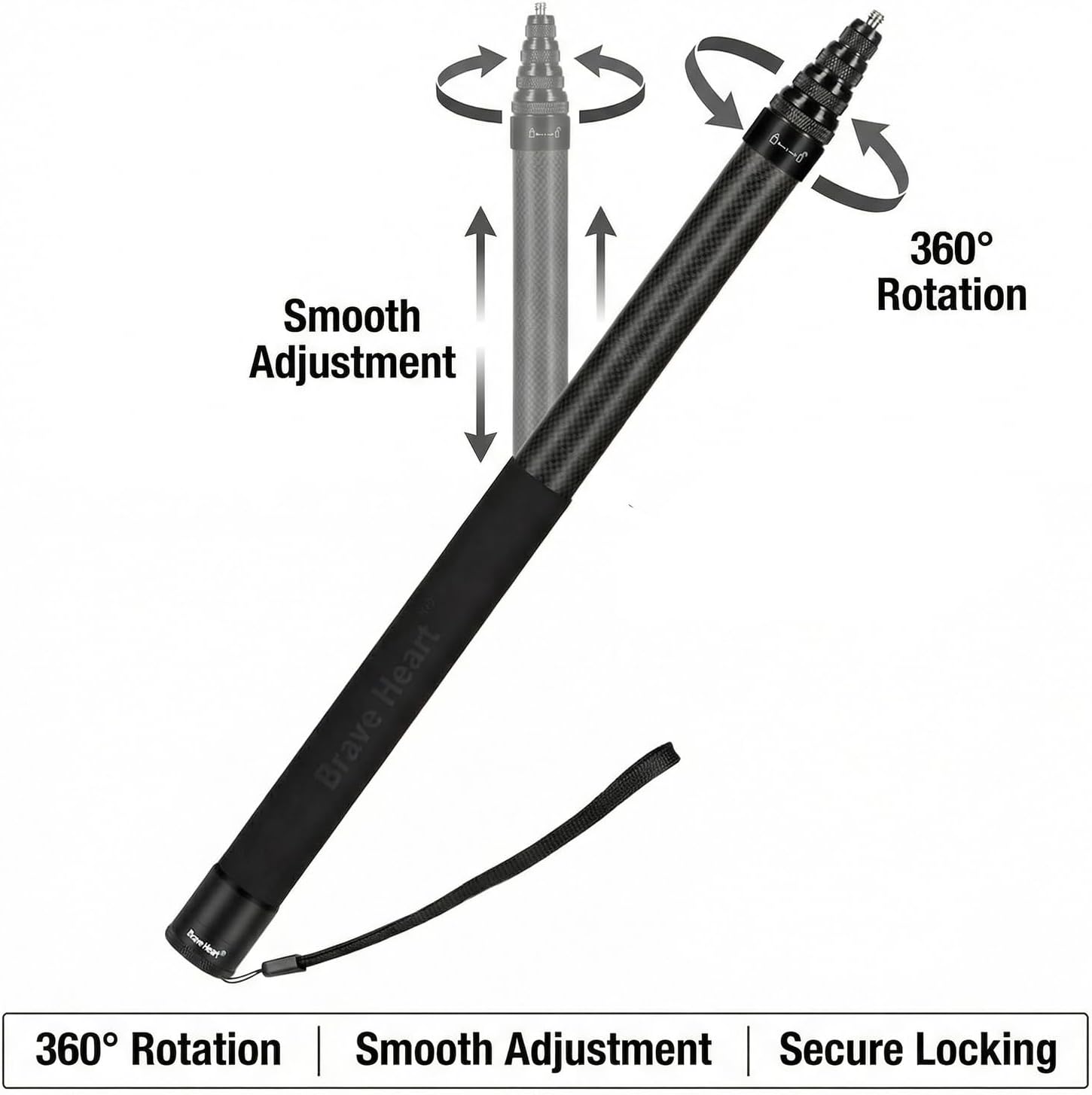 Discover a New Angle on Adventure with Our 3m Carbon Fiber Invisible Selfie Stick There's a moment on every journey—standing at the edge of a breathtaking vista, surrounded by friends at a concert, or carving down a fresh powder slope—when you wish you could capture not just what you see, but how it feels to be there. At full 10ft extension, this isn't just a selfie stick—it's your personal camera crew. Raise for your Insta 360 X5 or X4 above crowds at parades, over fences at scenic overlooks, and into angles that once required a drone. The invisible selfie stick design ensures the pole disappears in your 360 footage, leaving only the stunning, immersive view. Whether you're after sweeping landscapes or dynamic follow-me shots, the 3m selfie stick unlocks a third-person perspective that transforms ordinary content into cinematic memories. Engineered for the Journey, Light Enough to Forget We chose aerospace-grade carbon fiber not just for its strength, but for what it allows you to do: travel lighter. At a fraction of the weight of aluminum alternatives, this lightweight travel selfie stick slips into your daypack or carry-on like it's not even there. Hike all day, explore all week—your arms won't tire, and your content will thank you. Your Creative Partner, In and Out of Frame This selfie stick for insta 360 is more than an accessory—it's an extension of your creative vision. Perfect for travel vloggers chasing the golden hour light, action sports enthusiasts capturing every carve, or families wanting everyone in the frame without leaving anyone out. Use it as a monopod for stable low-angle shots, or extend it fully for that coveted drone-style aerial view.