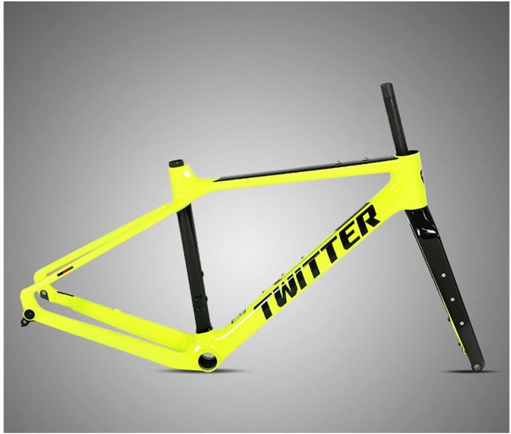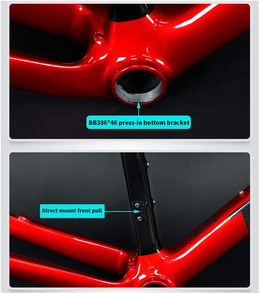 46/49/52/55cm Road Bike Frameset Carbon Fiber Off-road Racing Frame Thru Axle 100/142mm Disc Brake Frame And Fork Internal RoutingType: carbon road bike framesetFrame Size:46cm/49cm/52cm/55cmProcess :off-road class/Internal Routing/Hidden disc brake/Direct Mount Front Dial/Leisure and travel both , you can carry a variety of outdoor gearBrake type: disc brakeHeadset:52*52mm headsetSeatpost Size : 31.6mmSeat clamp size: 34.9mmBottom Bracket:BB386*46mm pressed-in bottom bracketThru axle spacing: front 12x100mm,rear 12x142mmFit for Tire:max for 700x40C TiresWeight: frame about 1390g,fork about 550gPackage Contents: Frame + Fork + Headset + Cable cover + Thru axle leverNote: Please check if the size of bike frame is correct before purchasing.Service:If you have any product and service problems, please contact us and we will reply with you within 24 hours.