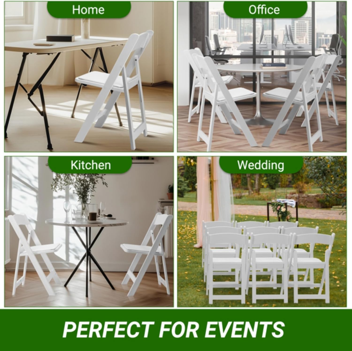 Experience the perfect combination of comfort and portability with our folding chairs with padded seats. With ergonomic design and soft PVC leather cushions, these chairs ensure lasting comfort even during long activities. Their foldable design allows for easy storage and transportation, making them ideal for family gatherings, outdoor camping, weddings and more. Specifications: 1. Material: PP, pearl cotton, PVC leather 2. Color: white 3. Product size: (17.5 x 17.1 x 30.7) inches / (44.5 x 43.5 x 78) cm 4. Net weight: 42.3 lbs / 19.2 kg Package includes: 4 folding chairs