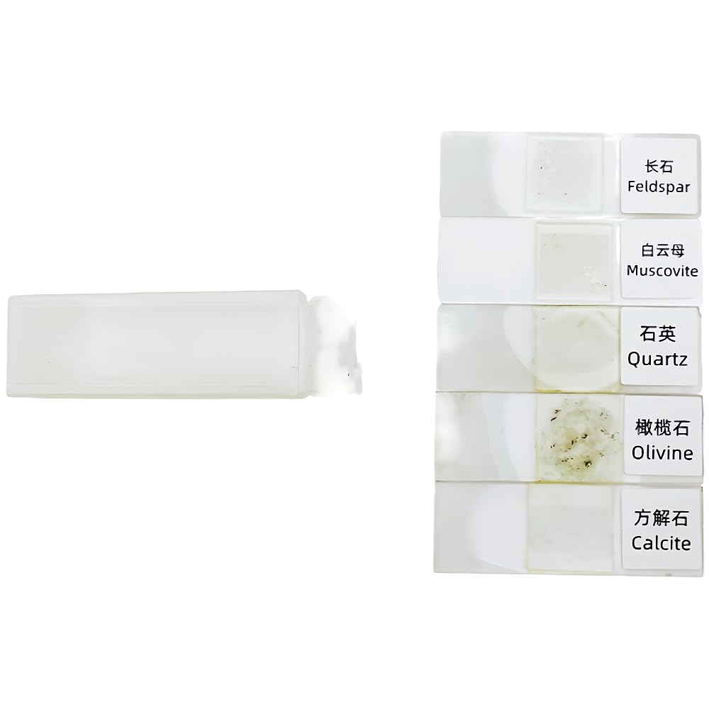5 Pcs Set Prepared Microscope Rock Slides Mineral Thin Sections 5 Choices The sale is for one box only and the slides are arranged for five different themes and are colour coded as following. Please select your favorite theme. Igneous Set: (Basalt, Peridotite, Gabbro, Diorite Dolerite) or Metamorphic Set: (Gneiss, Marble, Glaucophane, Olive serpentine rock Greenschist) or Sedimentary Set: (Conglomerate, Oolitic limestone, Sandstone, Tuff Calcareous shale) or Minerals Set: (Feldspar, Muscovite, Quartz, Olivine Calcite) or Total 4 set and use 24pcs wooden slides box pack (Igneous Set Metamorphic Set Sedimentary Set Minerals Set) Please pictures and list are only for information, please take the actual product as the standard. Fragile products, please handle gently. Microscope slide 76 x 25x 0.15mm, cover glass slides thickness 0.17mm, rock and mineral material thickness 0.03mm.
