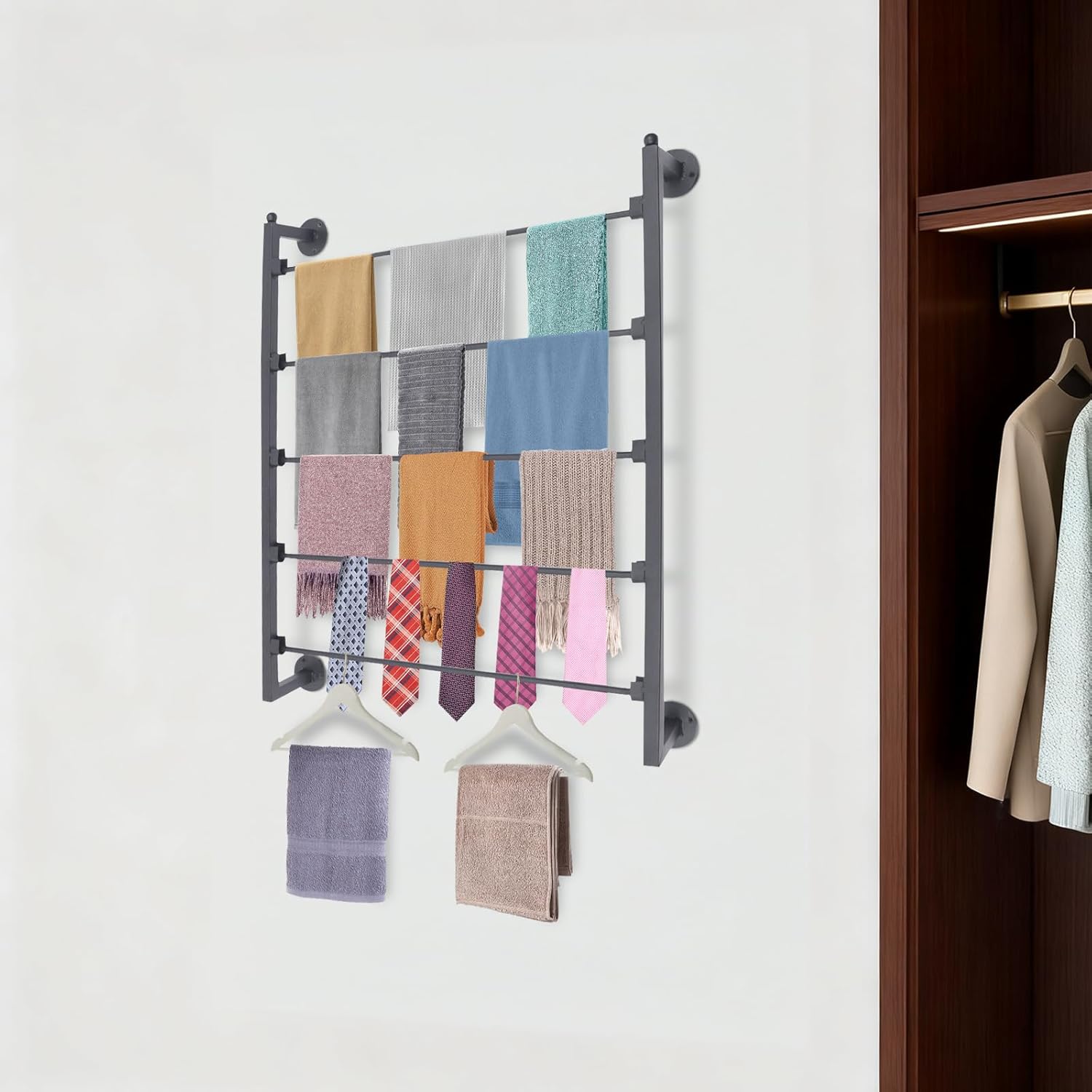 DetailsOpening Structure: It allows you to pick up/hang scarves faster and easier.Installation Disks: 4 installation disks with mounting holes allow you to easily install this product on the wall.ApplicationIt is suitable for storing and displaying scarves, towels, etc. in home bathrooms, retail shops, workspaces, dance studios, scarf shops, fabric shops, boutiques, and costume jewelry shops.SpecificationColor: BlackStyle: ModernMaterial: Steel PipesProcess: High-temperature Baking PaintAssembly Required: YesInstallation Method: Wall-mountedNumber of Tiers: 5Product Size: 60*10*75cm/23.6*3.9*29.5inInterval Between Tiers: 10cm/3.9inNet Weight: 2kg/4.41lbsPackage Included1* Scarf Display RackAll Accessories for Assembly