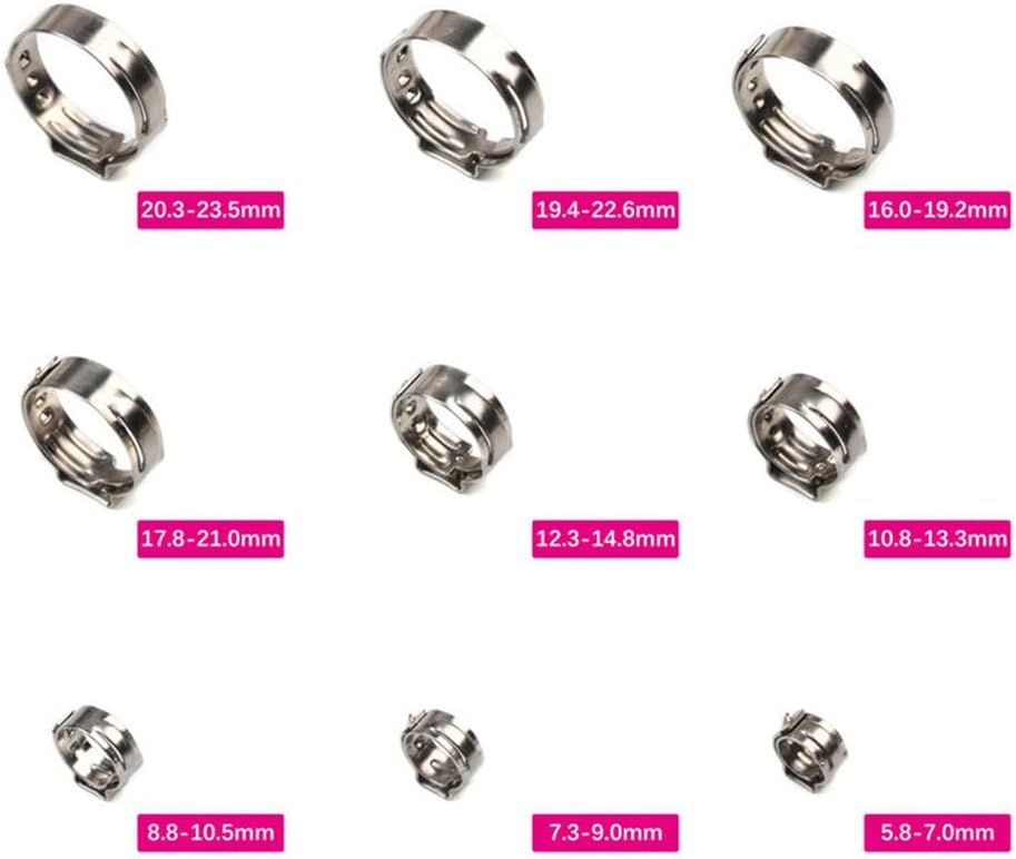 Material: Structure: Use: DIY Supplies:Plumbing Total Quantity:50pcs -304 resist -Stepless 1 ear clamp/single ear -Smooth inner band uniform compression 360° -Suitable demanding applications where lighter, thin-walled hose being used Package: 50 pcs x clamps(This product does not include pliers, please ) Notes: 1. Due manual measurement, please allow 0.1-0.3mm error. 2. Due to different computer colors, the actual product colour may be slightly different from the picture, thank you your understanding.