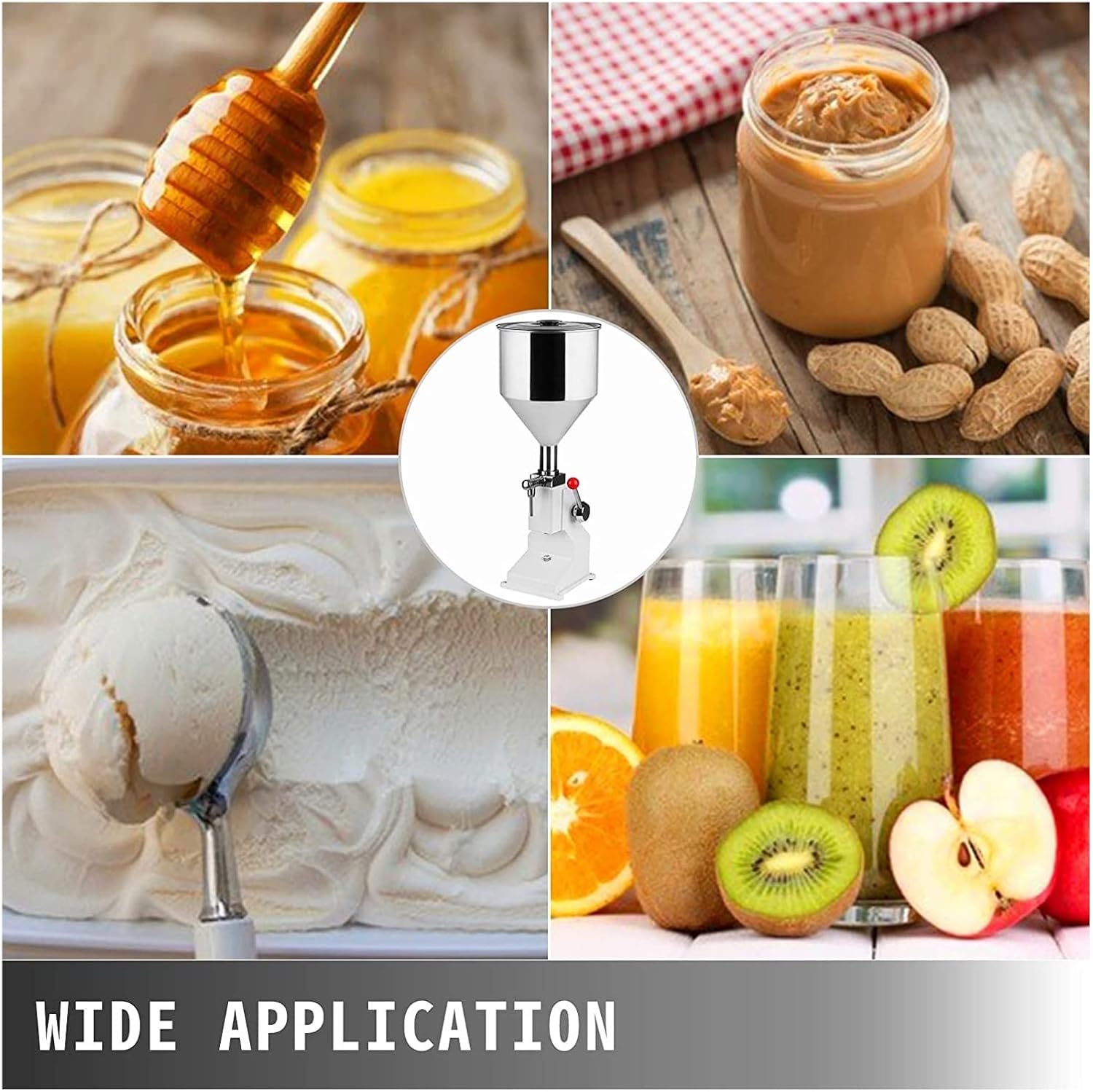 Liquid Filling Machine 5~50ml Manual Liquid Filling MachineFeatures:can only be used for liquid with good liquidityAll Parts in Contact with Product are Food Grade (SS 304/316).Stainless Steel Construction.40 bottles/min (depending on operator speed, product density, draw length, a fill speed, among others).Rugged Rotary Valve System Design.Pneumatic Operation.Silica gel O-ring System (cam bear 200 Celsius degree).Piston Feed Speed Adjustment.No-drip Option Included and Installed.Extremely Accurate (+/- 1%).Extremely Easy to Clean and Maintain.Sanitary Stainless Steel Quick Disconnect Fittings.Extremely Easy to Operate.Quick Connect/Disconnect Pneumatic Fittings.Completely Pneumatic, no electric.How To UseMake the handle up at first,then let the locking nut(Flg2.25) slip,circumgyrate the measure net(Flg2.26) CCW to the filling dose,or CW to reduce.Circumgyrate the locking nut close while you get right dosage.Technical:Filling Range: 5-50mlCapacity of Hopper: 22lbs/10kgHeight range: 7.87"/200mmBottle diameter range: 3-15 mmFilling material: liquid with good liquidityFilling accuracy: ±1%Machine size: 10.6 x 10.6 x 27.5 inch/ 270 x 270 x 710 mmPacking size: 14.96 x 14.96 x 31.10 inch/ 380 × 380 × 790 mmPackagingA03 Manual Filling Machine 1PcsNozzles 1PcsInside diameter 6mm outside diameter 8mm)O-Ring: 5PcsScrewdriver: 1PcsGuide Manual: 1Pcs