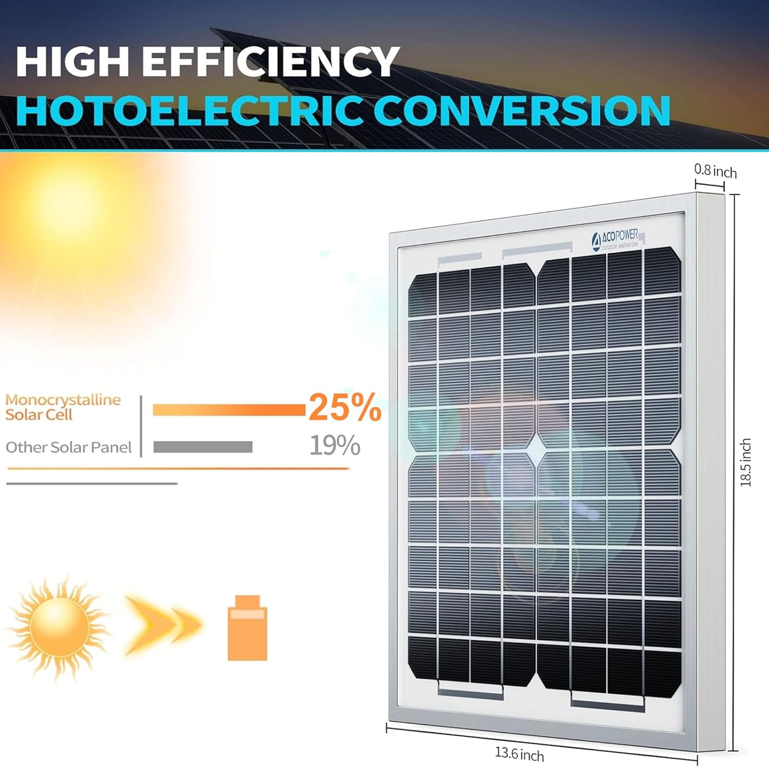 Product info. ACOPOWER 10W monocrystalline solar panel is the key component to a system when going solar off -grid system. These panels are relatively compact & are a breeze to set up. Whether you are going camping in the mountains or taking a trip to the beach, This panel can be a great start to your off-grid system This panel has several uses including marine, dry camp, RVs & other off-grid applications. ACOPOWER provides cost-effective solar panels & free Professional engineering services. Battery voltage: 12V Item condition: ACOPOWER brand new Manufactory location: Made in United States Product Specification Peak power (Max): 10W Short circuit Current (Isc): 0. 62A Open circuit voltage (VOC): 21. 88V Optimum operating current (Imp): 0. 57A Optimum power voltage (Vmp): 17. 5V Weight: 2. 6 lb Dimension: 11. 5*11. 5*0. 9" All technical data at STC Test condition: 1000W/M², AM1. 5, 25℃ Applications 40mm Courtyard lighting. Small household Lighting system. Street Lighting. Portable solar power. All small power electrical devices & small PV system.