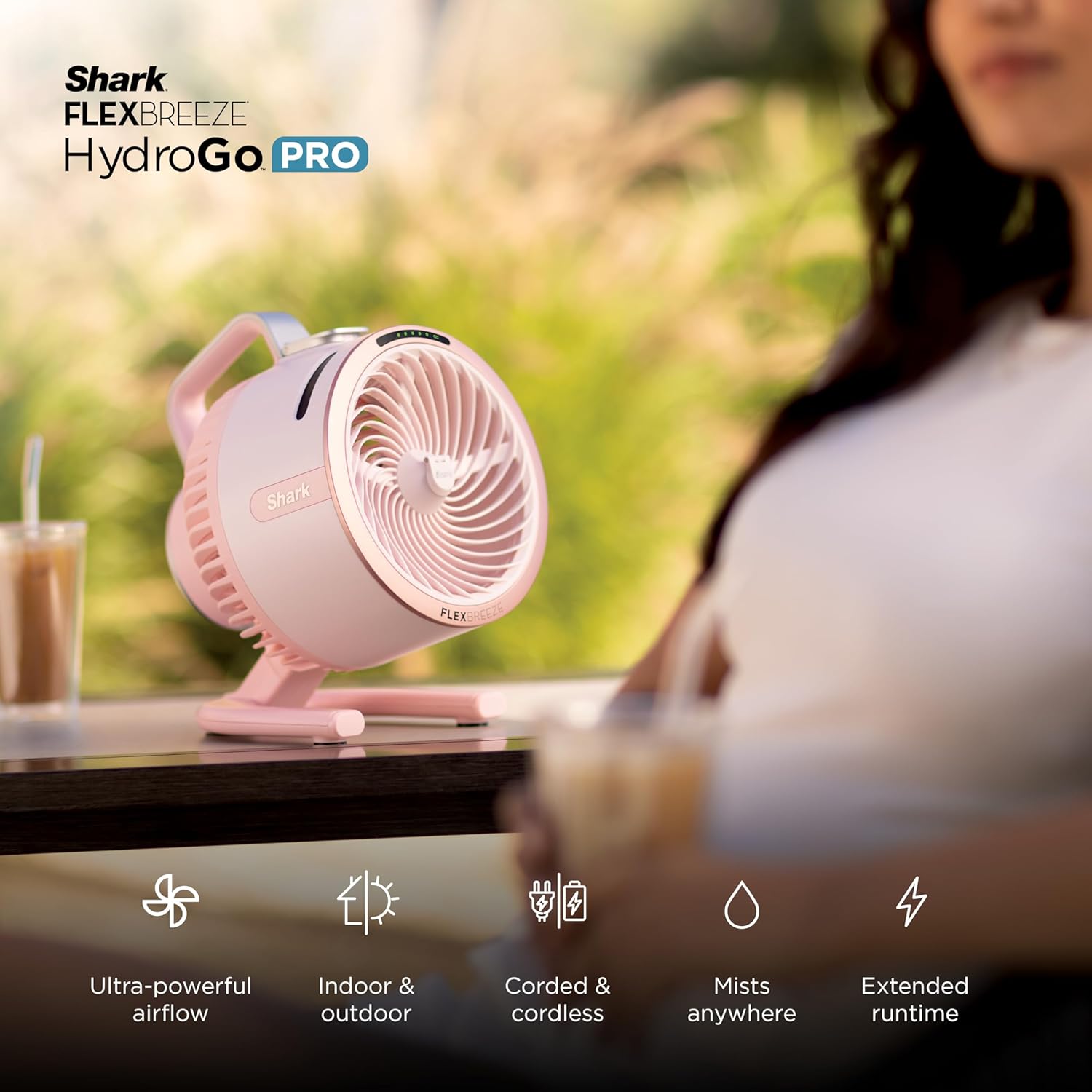 All-New Shark FlexBreeze HydroGo Pro is a portable and powerful fan with indoor and outdoor personal dry touch evaporative mist. Bring the breeze with an integrated tank. Go corded or cordless with the newest model’s extended battery runtime – 3.75 hours on max speed, and up to 29 hours on low speed. Bring the breeze where you need it with a built-in tank and handle.