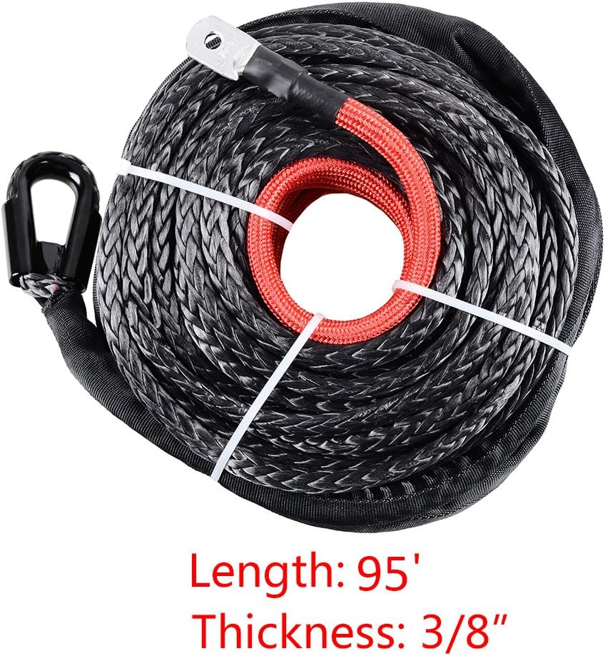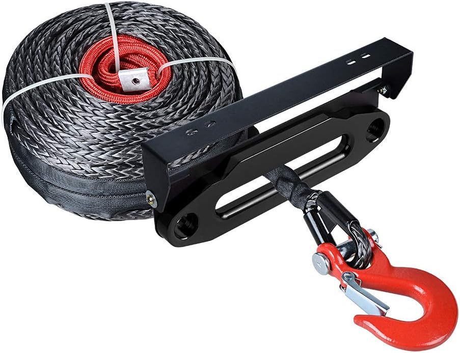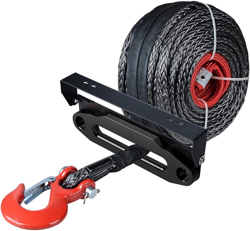Packet Condition: Brand New 100% * Packet contains: - 1X Synthetic Winch Rope + 1X Hook - 1X Hawse Fairlead - 1X Flip-Up Hawse Fairlead Mounted License Plate Holder + 2X License Plate Mounting Screws * Item Weight: 4022g * Color: Black, RedCompatible with most car, SUV, ATV, UTV with 10" bolt mount and 254mm Hawse Fairlead Mounted ** Winch Rope - Length: 95' (95 feet) - Thickness: 3/8" (3/8 inch) - Hook Size: Clevis Pin Diameter: 1/2" (1/2 inch) - Breaking Strength: Max. 20,500 lbs - Material: Synthetic Fiber Winch + Heavy Duty Steel Hook ** Hawse Fairlead - Mounting Hole (LxW): 10" (254mm) x 3" (7.8cm) - Load Capacity: 8000lbs to 15000lbs - Material: High-grade Billet Aluminum ** Flip-Up Hawse Fairlead - License Plate Bracket (LxWxH): 12 13/64" (31cm) x 2 3/4" (7cm) x 3"(7.5cm) - Mounting Space: 254mm - Mounting Hole Size: 15mm - Material: Steel NOTICE: * For safety, DO NOT pull out the 3 meter red protective sleeve when using and pull anything over 15,000 lbs * Ensure you read carefully the product description prior to purchasing the product * Your satisfaction is incredibly significant to us. Please feel free to contact us if you have any questions relating to the product and service