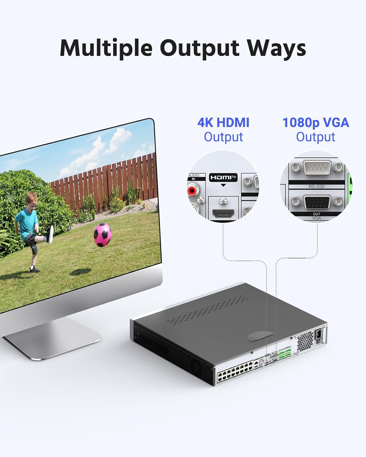 4K Smart Dual Light Turret Network Camera Lens: 4 mm Max resolution: 3840*2160(8MP) Video Bitrate: 32 Kbps - 16 Mbps Image Enhancement: BLC, HLC, 3D DNR Wide Dynamic Range: 120 dB WDR Image Sensor: 1/2.4" Progressive Scan CMOS Ethernet: 1 RJ45 10 M/100 M self-adaptive Ethernet port Storage: Built-in microSD/SDHC/SDXC Slot, up to 512 GB Operating Temperature: -22 °F – 140 °F/-30 °C – 60 °C Angle of View: Horizontal FOV 78°, vertical FOV 38°, diagonal FOV 96° ANNKE 32CH 12MP NVR Up to 32-ch IP camera inputs, plug & play with 16 PoE interfaces HDD: 4 SATA Interface Remote Connection: 128 Max Playback Channel: 16CH Audio Input/Output: 1/1 RCA Incoming/outgoing Bandwidth: 256/160 Mbps Decoding Format: H.265+/H.265/H.264+/H.264 detection2.0, ANPR, VCA(Need IP camera support) IP Video Input: 32 Channel (Include 16 Channel PoE) Video Output: HDMI up to 4K, VGA up to 1080p, CVBS Video output: mode: HDMI/VGA independent output HDD Capacity: Up to 10 TB Capacity for Each HDD(40 TB total) Network Interface: 1, RJ-45 10/100/1000 Mbps self-adaptive Ethernet interface Smart Event: Facial recognition, perimeter protection, throwing objects from building, motion Max Recording Resolution: Up to 12MP(4096 X 3072) 30fps(Frame rate depends on IP camera) Max Playback Resolution: Up to 12MP(4096 X 3072) 30fps(Frame rate depends on IP camera) Network protocol: TCP/IP, DHCP, IPv4, IPv6, DNS, DDNS, NTP, RTSP, SADP, SMTP, SNMP, NFS, iSCSI, ISUP, UPnP, HTTP, HTTPS