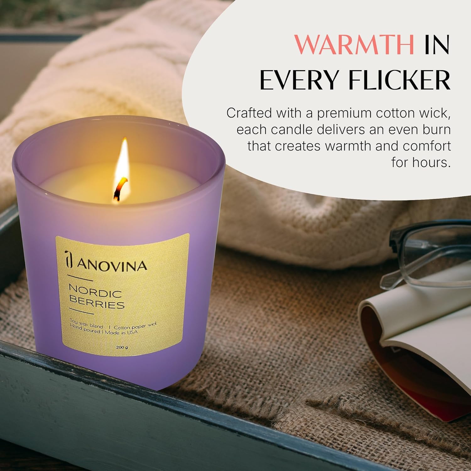 Bring modern elegance home with Anovina’s Nordic Berries candle — a beautifully crafted soy blend jar designed for a clean, even burn. Hand-poured in the USA with a cotton wick and minimalist aesthetic, it adds a touch of refined décor to any room. The fragrance opens with bright berry notes layered over soft florals and warm musk, creating a rich, cozy atmosphere that feels inviting and upscale — the kind of scent you notice the moment you walk into a luxury hotel lobby. It’s a warm, memorable aroma that fills your space without overpowering it. Whether you’re setting the mood for a relaxing evening, welcoming guests, or elevating your everyday environment, Nordic Berries brings a signature touch of comfort and style. Beautiful on a coffee table, nightstand, or bathroom shelf, it’s a candle you’ll reach for again and again.