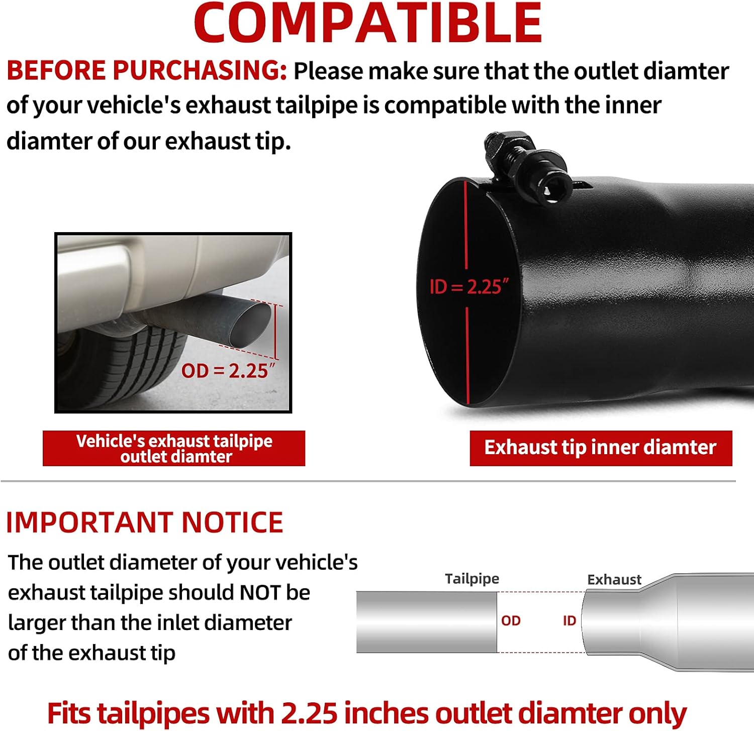 | Tip Description | Please Measure the Outside Diameter of Your Car Tailpipe before Purchase Universal Exhaust Tips, and Make Sure the Outside Diameter of Tailpipe suits the Inlet Diameter of Exhaust Tips. |