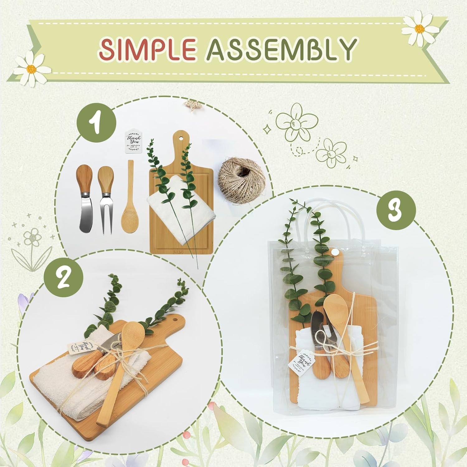 | Included Components | Cheese Board (6), Spoon (6), Fork (6), Butter Knife (6), Towel (6), Thank-you Card (6), Present Bag (6), Artificial Eucalyptus Stem (12), Rope (1 roll) |