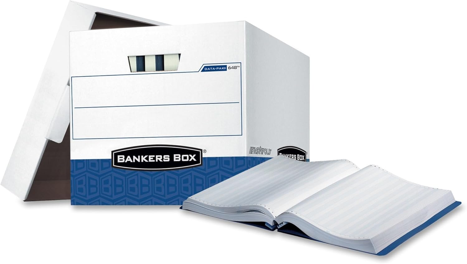 Bankers Box DATA-PAK Storage Boxes are ideal for stacking and storing computer printout binders. Heavy-duty, triple-end, double-side, double-bottom construction withstands the weight of heavy bound computer printouts. FastFold® quick and easy assembly. Reinforced tear-resistant handles make box comfortable to carry. Deep, locking, lift-off lid stays in place for secure file storage. Perfect for use in your home, office, home office, school, or wherever you have storage needs.