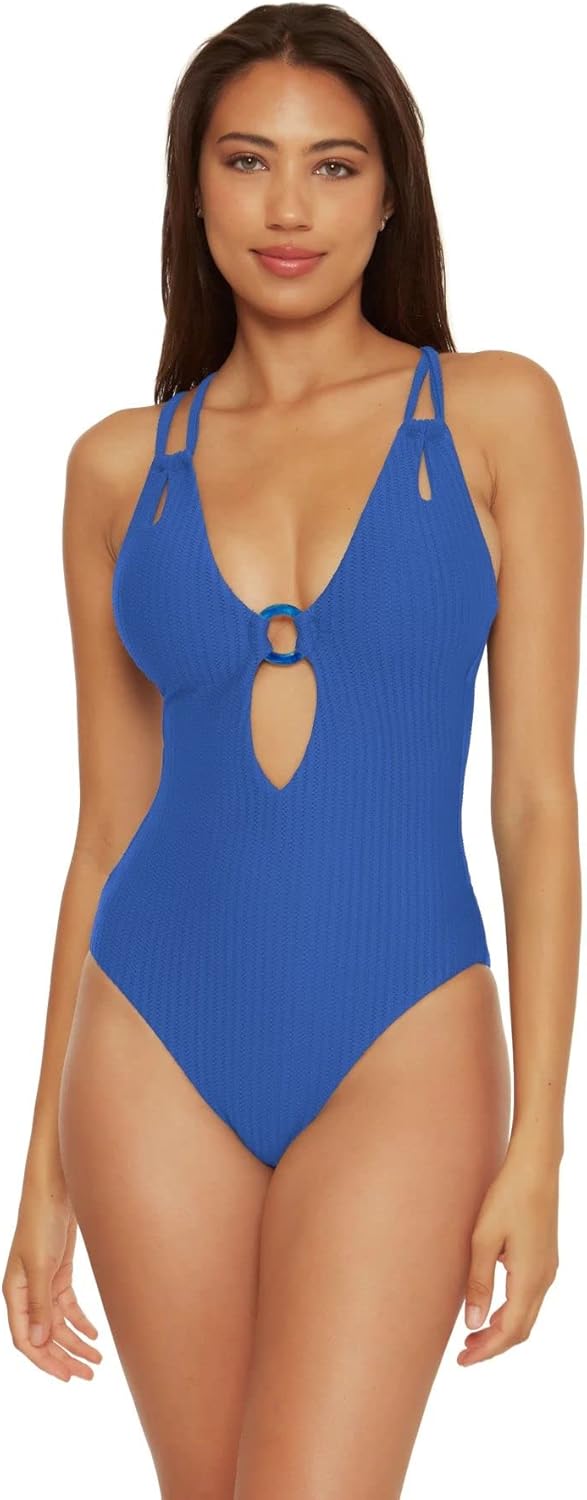 Flaunt a cool beachwear look wearing BECCA by Rebecca Virtue Line in The Sand Lainey Textured Rib Plunge One-Piece. Tear drop cut out front strap. Adjustable straps. Removable cups. Crystal wash ring. Rib pucker texture. Pull-on closure. Back tie-up closure. 95% recycled polyester, 5% spandex. Hand wash cold, line dry in shade.