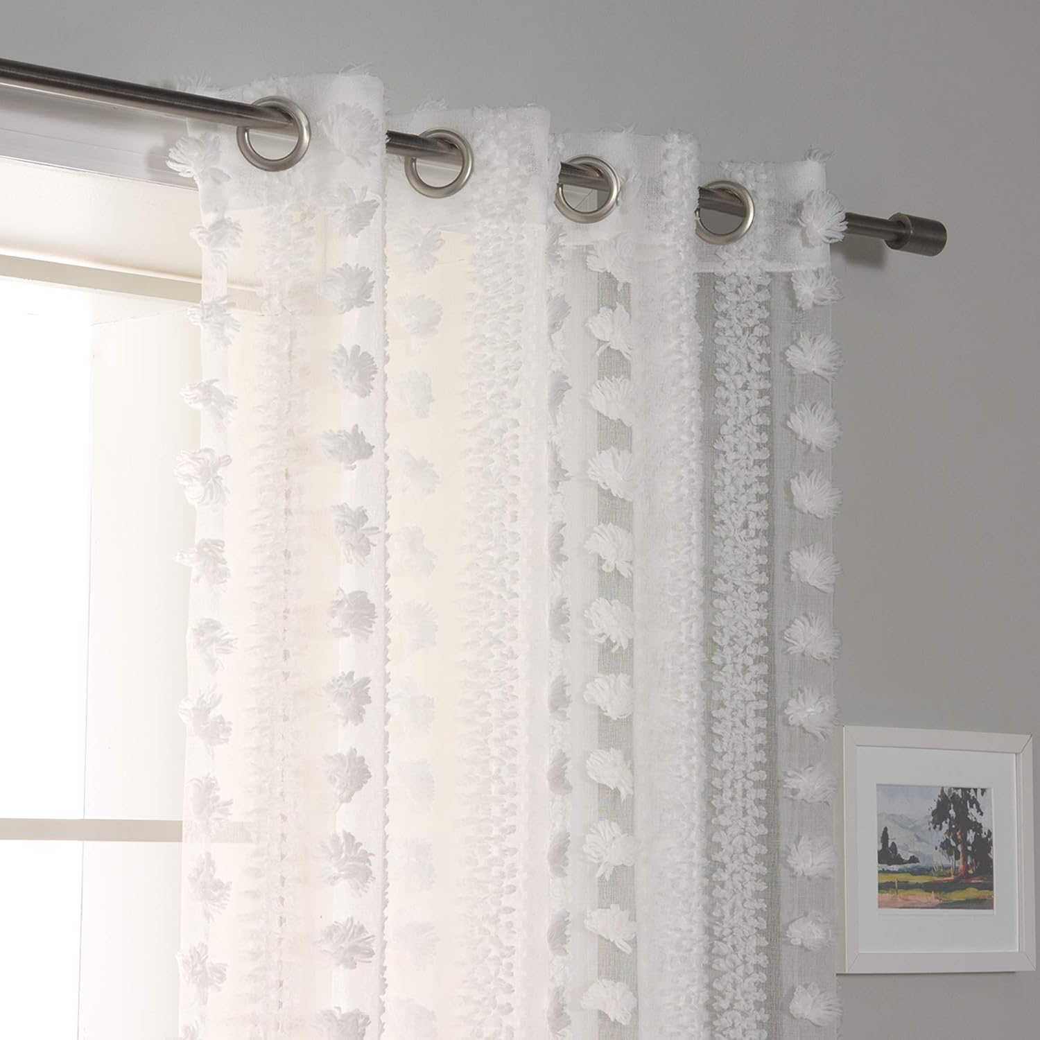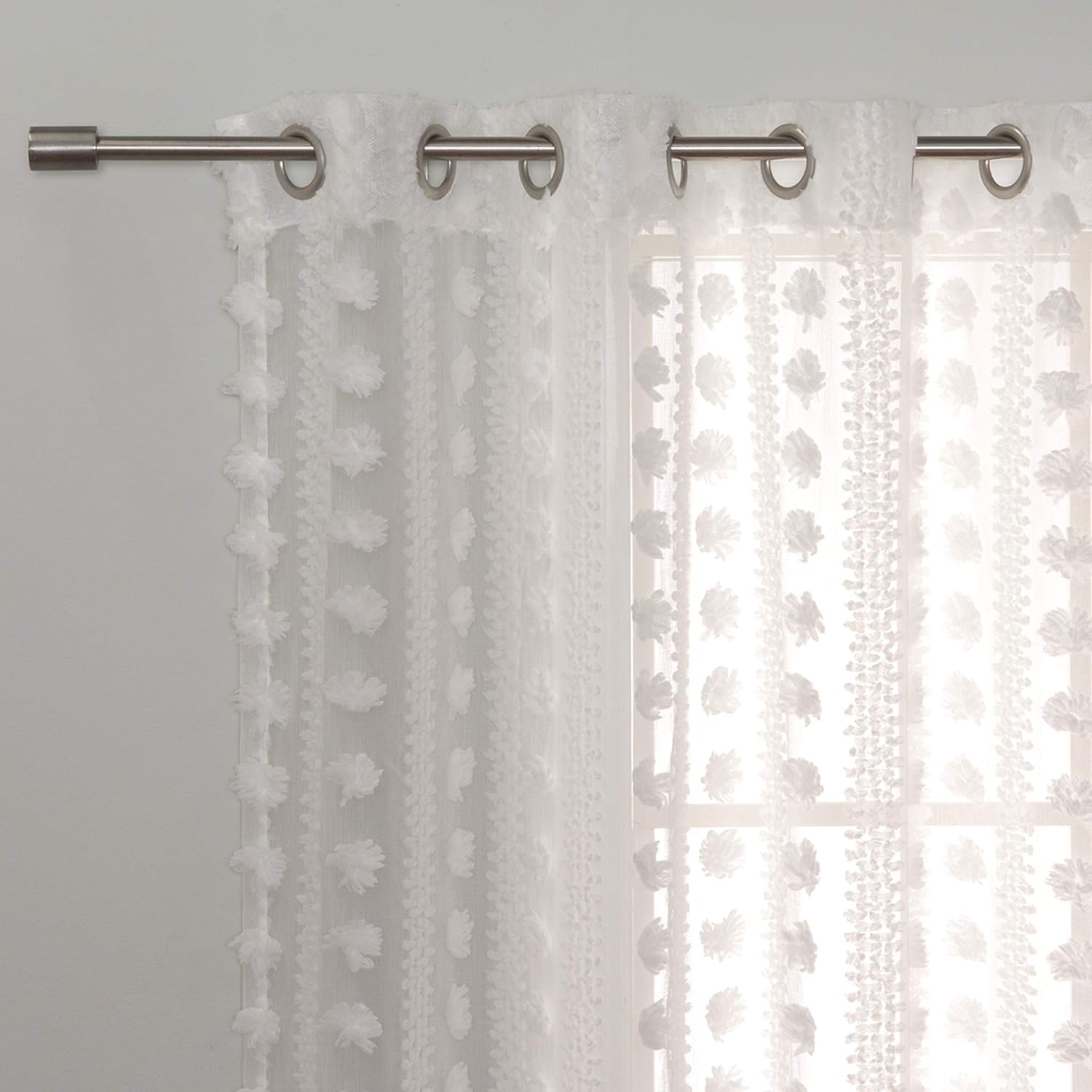 Sheer Pom-Pom/Daisy Curtains Whimsical and charming describe these Sheer Pom-Pom/Daisy Curtains. The decorative tufts are uniquely designed to be fluffed up into fun pom-poms or flattened into delightful daisies. Featuring a sheer background, these panels bring a light and soft look to a room while adding loads of personality. Available in versatile white or pretty pink. CARE INSTRUCTIONS - Machine washable - Machine wash cold with like colors - Use only non-chlorine bleach when needed - Tumble dry low