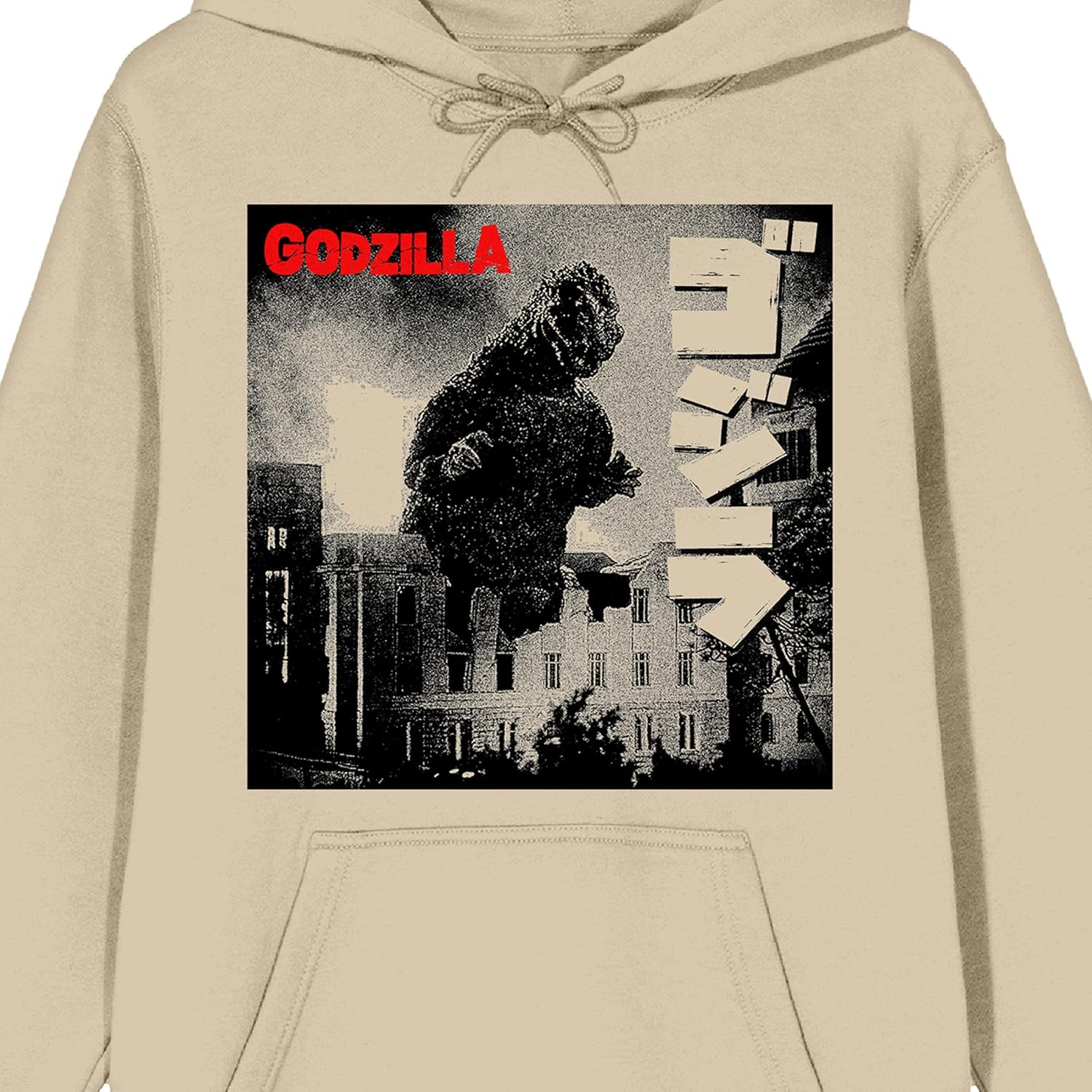 Unleash the king of monsters with this adult cream Godzilla long sleeve hooded sweatshirt. The striking half-tone poster design features Godzilla rampaging through the city, with bold red letters spelling out "Godzilla" at the top. Crafted from a soft cotton-polyester blend, this hoodie provides comfort and style, complete with an adjustable hood for added versatility. Easy to care for, simply machine wash it on cold with like colors and tumble dry on low heat. Perfect for fans of the iconic creature, this sweatshirt combines comfort and fandom seamlessly.