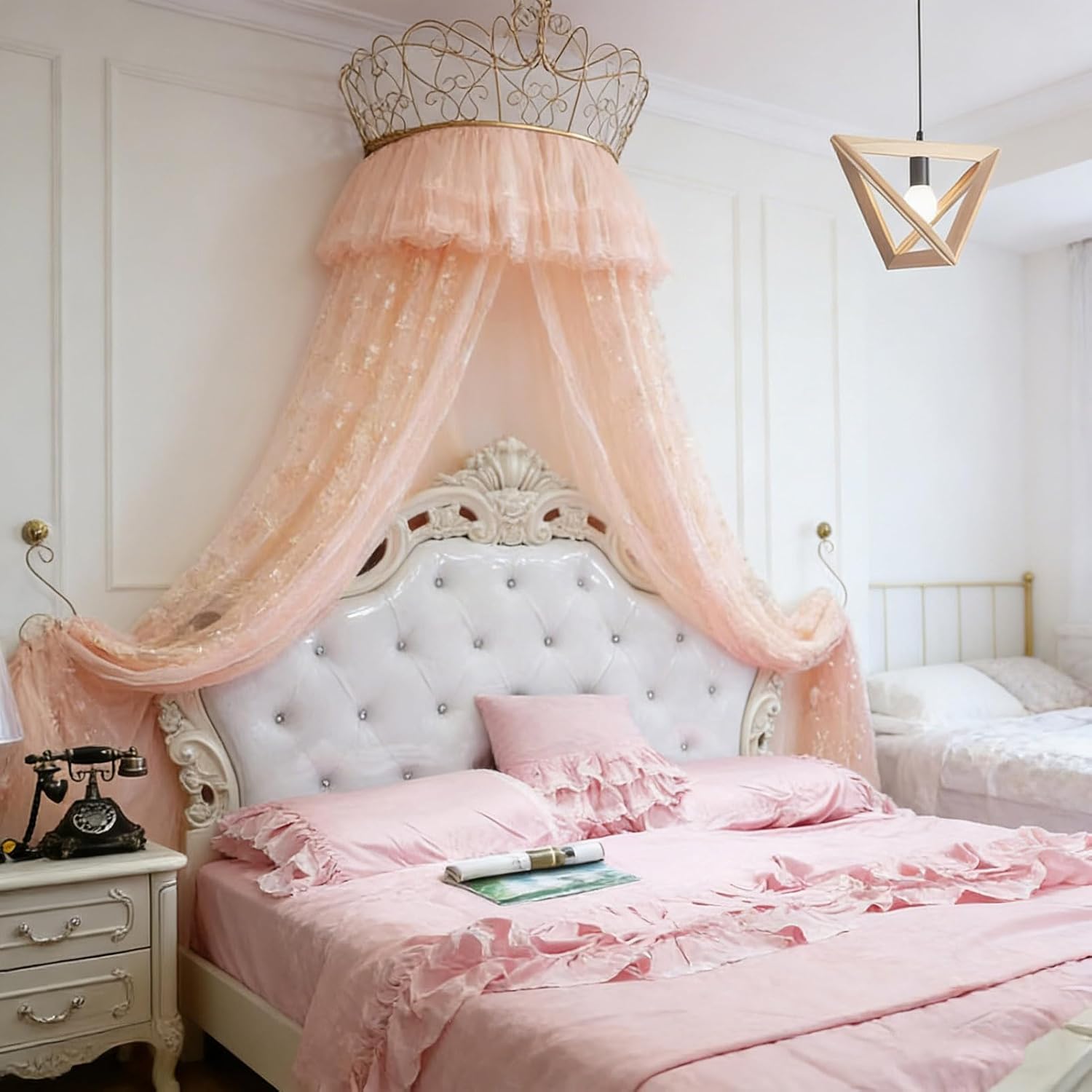 Designed to create a dreamy bedroom, this European-style princess-themed crown canopy features a vintage wrought-iron crown as its centerpiece, paired with double-layered lace curtains, seamlessly blending European romance with a princess aesthetic. Whether in a child’s room, a princess-themed room, or a European-style bedroom, it instantly elevates the room’s aesthetic and creates a warm, romantic sleeping atmosphere, making it an excellent choice for headboard decor.Specifications:Overall Design: European-style princess crown canopyCrown Outer Diameter: 70cm(27.6in)Main Materials: Wrought iron crown frame + double-layer lace chiffon fabricInstallation Method: Wall-mountedCompatible Bed Types: Standard home bedsSuitable Settings: Children’s rooms, princess-themed rooms, European-style bedrooms, headboard soft furnishingsPackage ContentsCrown Bed Canopy x 1Matching wall-mounting hardware x 1Installation instructions x 1
