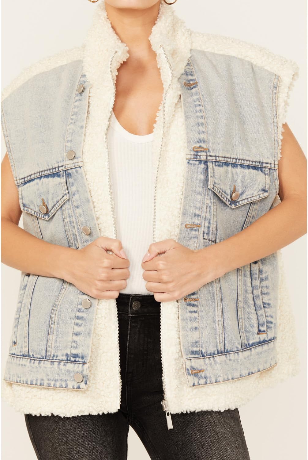 | Style | Light Wash Denim Trucker Vest W/ Faux Sherpa Detail in Snow Bank |