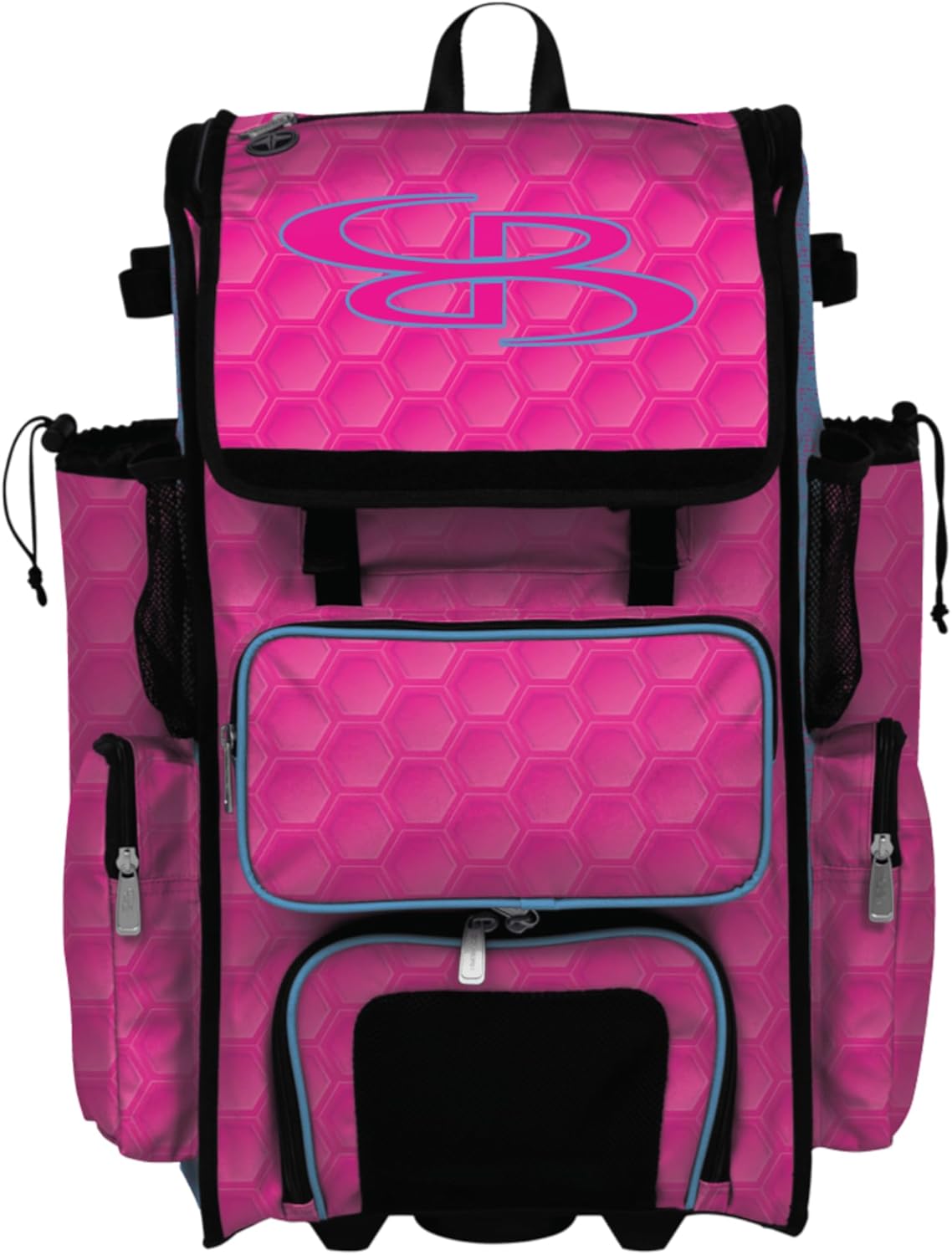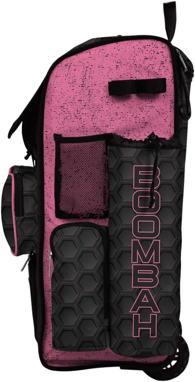 Boombah Rolling Superpack 2.0 3DHC Baseball/Softball Bat Bag - 23-1/2" x 13-1/2" x 9-1/2" - Multiple Colors - Telescopic Handle and Holds 4 Bats The new and improved Superpack Rolling Bat Bag 2.0 is an extremely durable and versatile bag for diamond sports with a focus on convenience and longevity. Key features include: - Built to Last: Engineered with the highest quality materials, our products are made to work as hard as you do - Heavy Duty Hardware: Zippers, straps, and fence hooks built for the rigorous abuse of the season - Improved Base Chassis: New molded plastic base is significantly stronger and stiffer, preventing your bag from slumping when full. It also contributes to keeping the handle in place and maintaining its strength - Larger Heavy Duty Wheels: Now 40% larger than before - now nearly 4 inches wide. The new improved wheels lift the bottom of the bag over a half inch higher off the ground to prevent scraping on dirt and gravel - Reinforced J-Hooks: Easy to hang on the fence - Shoe Compartment: Keep items separate from the dirt and dust on your shoes by storing them in an individual compartment - Telescopic Handle with Additional Handle Position: Telescoping handle has an additional, shorter height option for younger players. The handle can now be adjusted to a position 4 inches shorter than the standard, fully-extended length - Valuables Pocket: Small exterior pocket made to store your phone, keys and wallet so you can easily access what you need - Wear-Resistance Fabric: Heavy duty fabric has been added to the bottom of the bag (includes the bat sleeves), to further improve the lifespan of the bag. The material is specifically designed to resist scrapes/tearsAbout Boombah: Boombah baseball / softball products are part of our huge family of sporting gear, apparel and accessories. We design and manufacturer our own line of high quality sports equipment and gear for the sports you love.