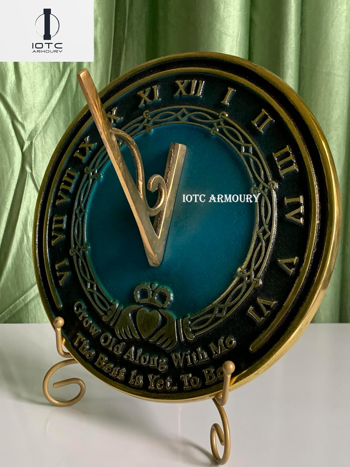 This round sundial is hand-cast from solid brass. It features the inscription ‘Grow old along with me, the best is yet to be’. The sundial’s face is easy to read with Roman numerals & a pretty floral design. A wonderful addition to your garden or patio & a perfect gift for any occasion. Garden Sundials are unique time telling pieces with roots in ancient societies. When placed at the correct angle, sundials use the sun to tell time as well as being beautiful and ageless decorative items.Sundial makes a perfect birthday gift, personalized anniversary gift or unique wedding gift idea.Perfect gift for mom or dad for anniversary, birthday or any really special event.The sundial made of brass composite and Manufacture By IOTC ARMOURY.