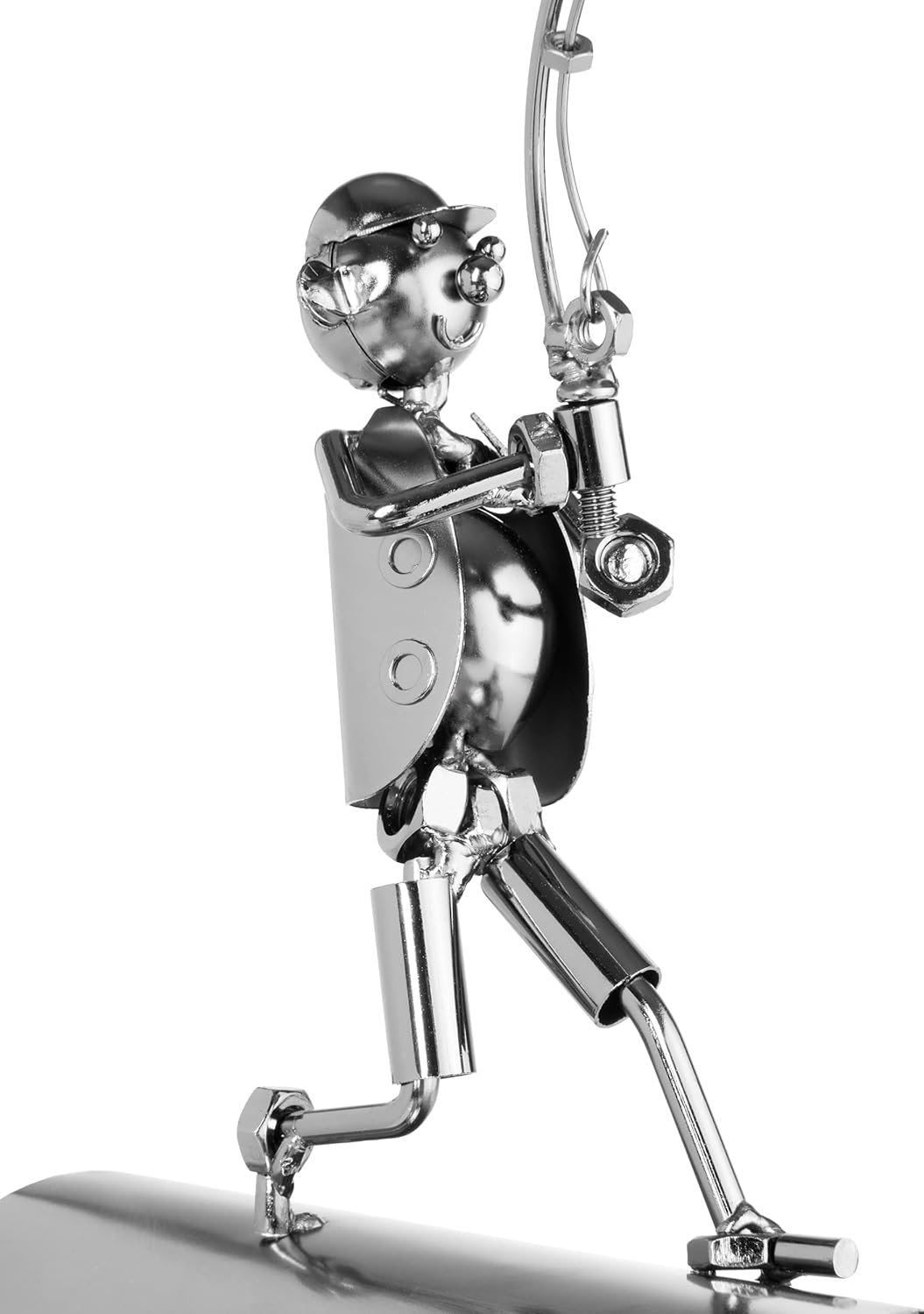 Metal wine bottle holder 'Angler' with many details like the indicated billowing sea and the detachable cast net - including greeting card!An original gift idea as a wine gift for anglers as an invitation for boat fishing or as a presentation for a fishing trip gift, as a birthday present, for retirement or many other occasions.Product detailsThe maximum bottle diameter is approx. 3.54 inches (9 cm) Height: 14.2 inches (28 cm), width 4.1 inches (10.5 cm), length 9.3 inches (23.5 cm) without bottle The wine bottle is not included Including a gift cardOur bottle holders are an individual and personal gift idea for all occasions, e.g. as a Christmas gift, wedding gift, anniversary gift, birthday gift, Mother's Day gift, Father's Day gift, Easter gift, Valentine's gift, anniversary gift, as a gift for a close friend, best friend, work colleague, angler friends...