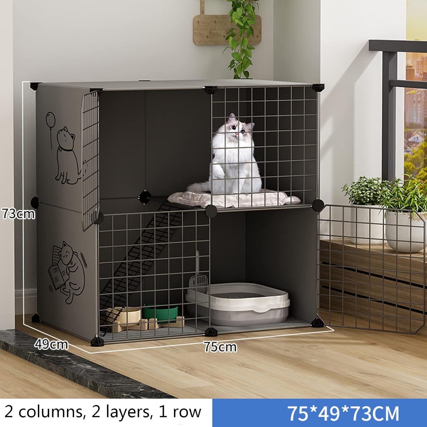 This cage offers safe space for even the most energetic cat to run, jump and play! It promotes health and longevity, your furry friends could get physical and mental stimulation. This spacious cat cage will ensure your pet is always fresh and happy. Name: DIY cat cage / Pet fence / Pet playpen / Cat crate / Cat house / Cat cage villa / Cat apartment cage Colors: Gray, Pink, Yellow Material: Resin, Plastic Size: 75*39*73CM , 75*49*73CM , 75*75*73CM , 75*39*109CM , 75*49*109CM , 111*49*75CM Package A: Climbing ladder, Wooden hammer, Package B: Climbing ladder, Wooden hammer, Cat nest, Cat hammock Package C: Climbing ladder, Wooden hammer, Cat nest, Cat hammock, Litter tray Suitable: Cats, guinea pigs and ferrets , Rabbits and other small pets Cat enclosure is a must-have for any cat lover. The cage package comes with concise and hassle-free assembly instructions, requires no tools to be added, and can be installed in 15-30 minutes. The cat cage can be fully folded when not in use for easy storage and portability without taking up your space. Packing list: Cat cage *1 Package A/B/C/D *1