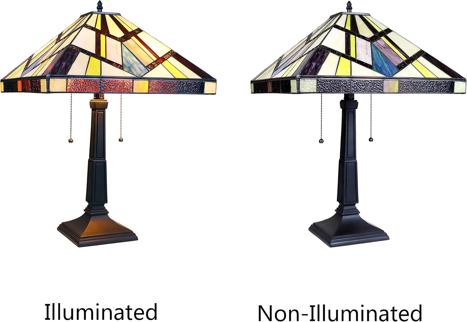 Vincent is a beautiful, stained glass table lamp in a traditional Mission style, featuring a blackish bronze base and 2 pull chains switches. This lamp would be perfect in a bedroom, living room, and dining room. The shade is hand-crafted, using the same methods developed by Louis Comfort Tiffany in the early 1900's. This process entails using 148 hand cut stained art glass pieces, each wrapped in fine copper foil and soldered together at extremely high temperatures to form each unique piece. Exact size to the nearest inch may vary, and exact color of each glass piece may vary due to each piece being hand crafted. First image is with the light shining through, second image is with no light. Dry listed and recommended for an indoor setting.