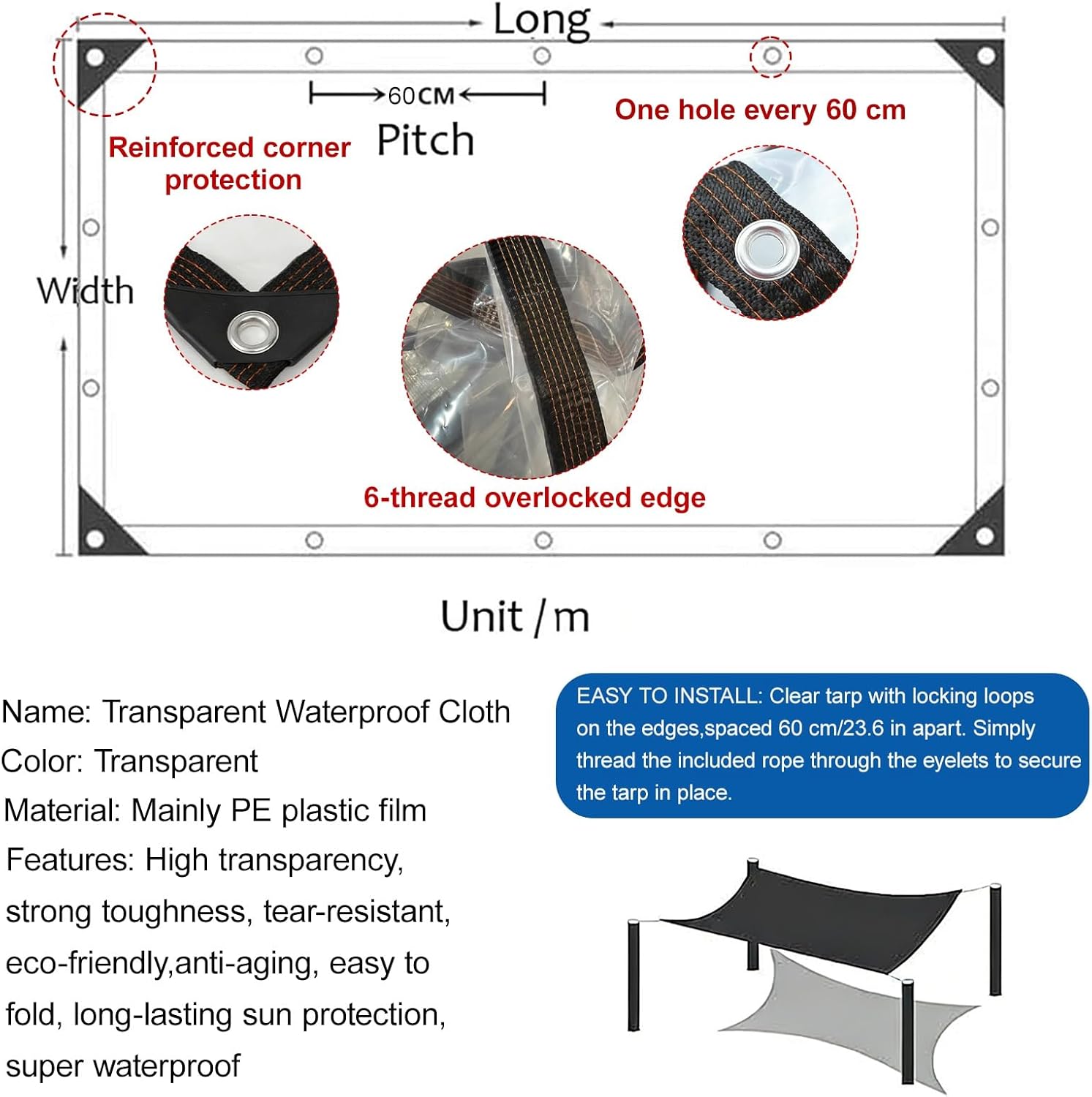 Heavy-duty clear vinyl tarp is waterproof, windproof and durable, with reinforced edges and grommets for easy fixing. It insulates in winter, shields sun/rain in summer, and suits greenhouses, patios, vehicles, camping and storage.Product InformationMaterial: PEColor: ClearWaterproof Index: 100%The distance between the buttonholes is about 60 cm.Features:1. Six Sealing EdgesThe transparent plastic tarp has six sealing edges,makes it durable and long service life.2. Tear ResistanceThe 4 corners of the tarpaulin have triangular protection angles, which increase the tension and will not cause tearing.Package Contents:1 x Tarpaulin, Sufficient rope and hooksNote:1. Due to manual measurement, there may be slight measurement error, hope you can understand. please forgive 1-3cm error.2. The product is not completely transparent, the transparency is about 80%. Please forgive me for the shooting problem. Thank you for your understanding.3. The new tarpaulin may have a plastic smell. Under normal circumstances, just place it in a ventilated place for 1-2 days. The smell of plastic will spread