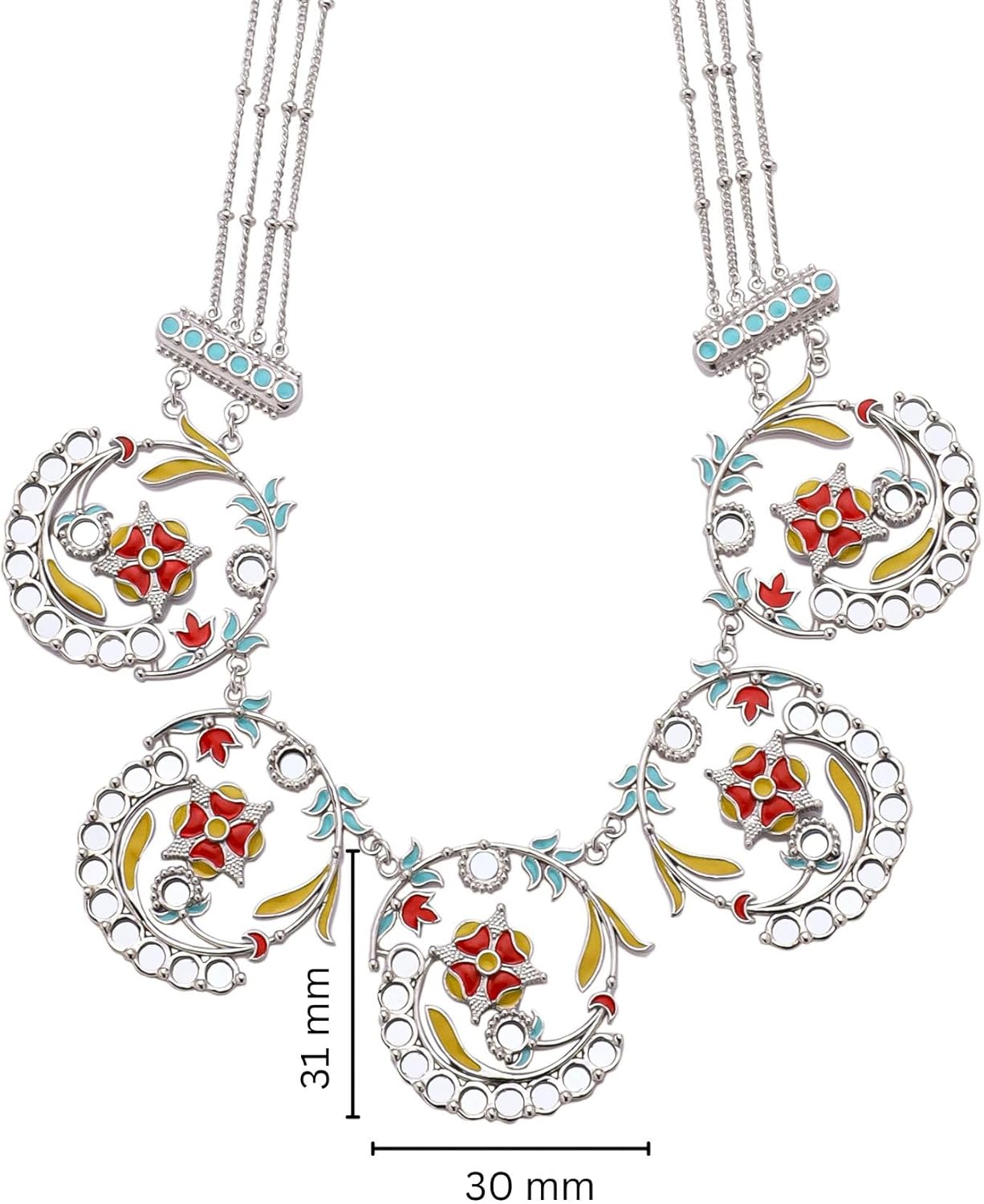 The Garden of Dreams Multi-Strand Necklace captures the essence of a vibrant Nubian garden in full bloom. With radiant floral motifs rendered in vivid red, yellow, and blue enamel, this necklace brings the magic of lush blossoms and winding vines to life. High-polish brass with a white rhodium finish enhances the brilliance of each element, while delicate mirror accents reflect light with every graceful move. Designed with multiple strands for added texture and elegance, this necklace invites you to immerse yourself in a dreamscape of color, culture, and timeless beauty. Base Metal: Hypoallergenic Brass Plating: White Rhodium Finish: High Polish Enamel Colors: Red, Yellow, Light Blue Other Materials: Mirror Accents Weight: 45.88 g Adjustable Chain Length: 18 + 2.5"