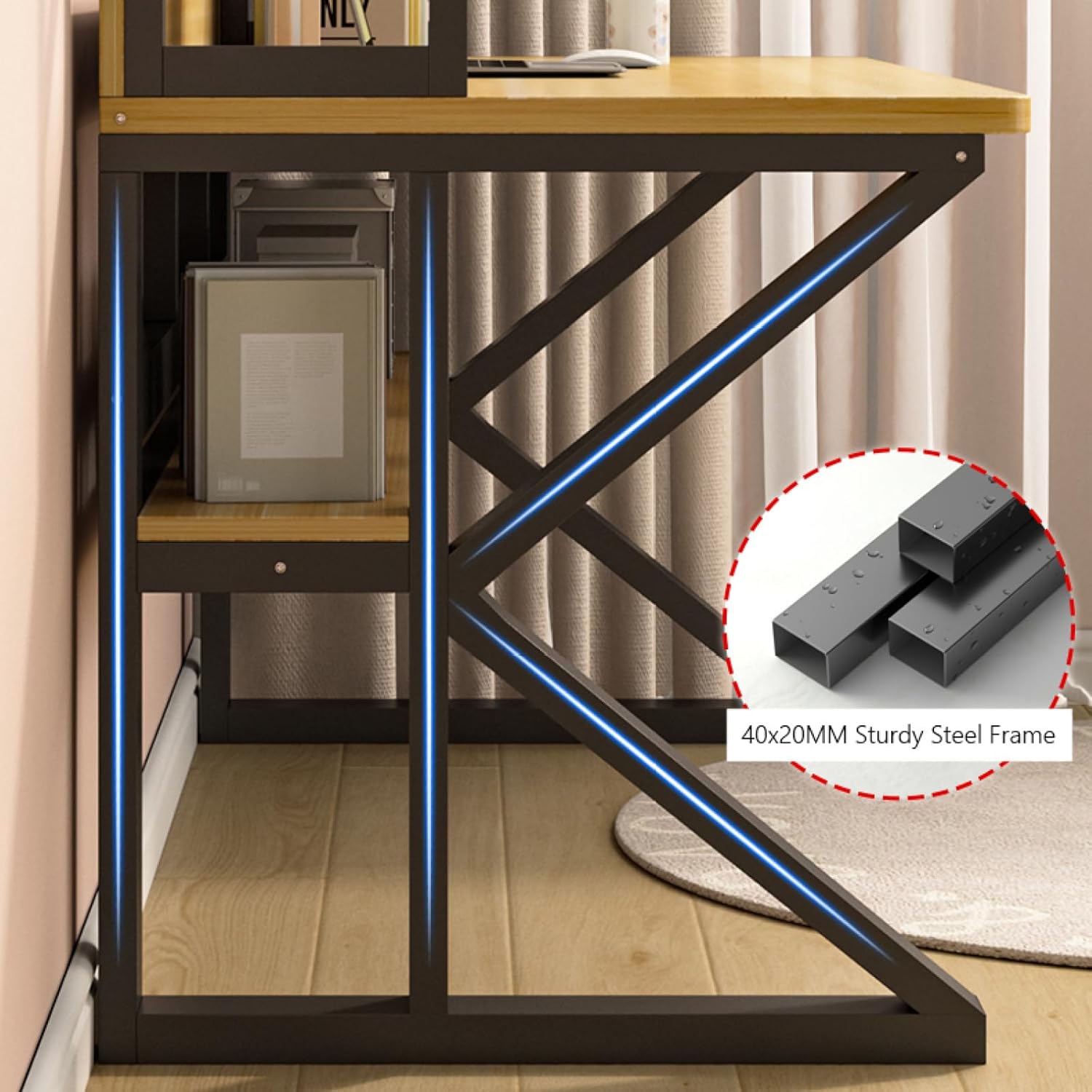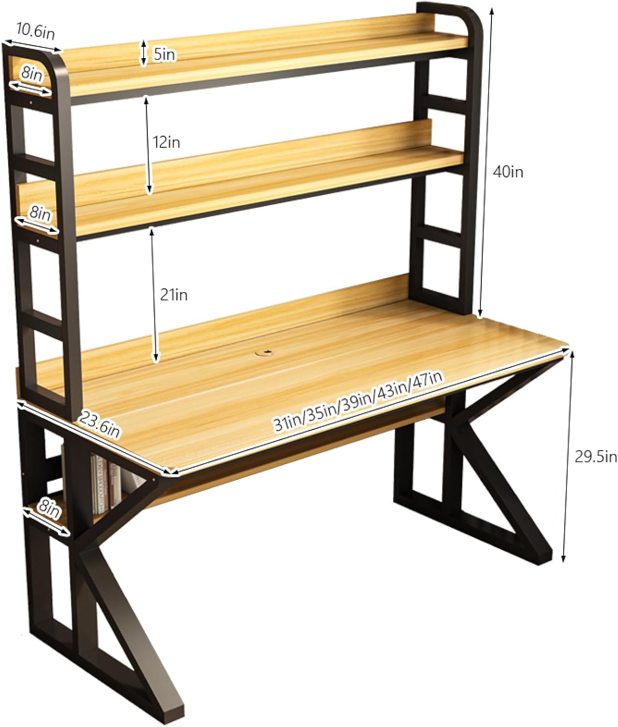 Solid Wood Desk Writing Desk Computer Desk Study Desk Home Office DeskGet all your work done and enhance the aesthetics of your home with this modern computer desk. Whether you need a spot to study, do craft or just finish important work, it will fulfill your requirement. The Computer desk with storage shelves features a compact and lightweight design that is a perfect addition to any small home office, kid's room, or any area that needs a work surface!PACKAGE INCLUDES1 x Computer DeskDURABILITY & STURDY CONSTRUCTIONWide and thick solid wood tabletop and strong metal legs for this home office desk provide the maximum stability and durability. It can withstand the pressures and weights of daily use and long-term placement, ensuring the stability and longevity of the computer desk.OPEN SHELVES, EASY REACHThe top hutch can place books, files, and plants,leaving spacious space for writing, paperwork, and other home office activities. The bottom storage shelf design enlarged the desk storage capacity, which can be used for storing audio, router boxes, etc. Makes the desktop more concise. The shelf also makes the desk more stable.BEZEL The baffle design allows items to be stored safely, and you do not have to worry about falling when you place things against the wall.EASY ASSEMBLYOur writing desk is easy to assemble, contains screws, tools and instructions required for installation, no additional tools are required. Follow the assembly steps to complete easily within 40 minutes.Multipurpose desk adds function and style without overwhelming the space. Looks great in your living room, family room, home office, bedroom or condo. Provides plenty of space for office work, studying, writing or gaming.