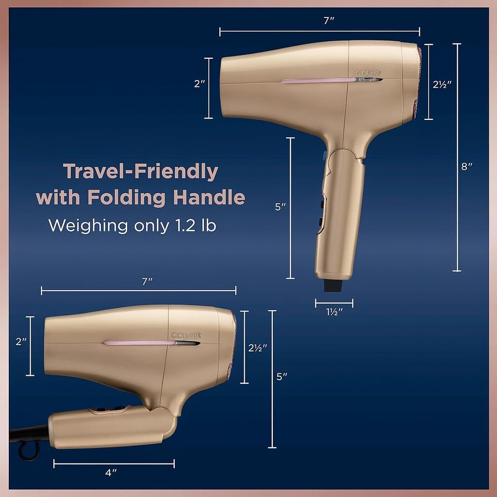 🌍 Worldwide Smart Voltage Technology – Designed for travelers, this dryer automatically detects foreign voltage and adjusts for safe use in 125V or 240V outlets. Perfect for trips across the globe without needing a separate voltage converter. 💨 Powerful & Lightweight – With 1875 watts of fast-drying power packed into a compact design, it delivers salon-quality results while weighing only 1.2 lbs. ✨ Ionic Technology – Reduces frizz and boosts shine, leaving hair smooth and manageable. Ideal for all hair types. 🔥 Custom Heat & Speed Settings – Choose from 3 heat settings and 2 speeds for flexible styling. Includes a Cool Shot button to set styles in place. 👝 Compact & Travel-Friendly – Features a folding handle for easy packing in suitcases or carry-ons. Designed to save space without sacrificing performance. 🎯 Styling Attachments Included – Comes with both a concentrator nozzle for sleek, polished styles and a diffuser for enhancing natural curls and waves. Product Highlights: Sleek Champagne Gold finish for a premium, modern look. Award-winning: Recognized by Good Housekeeping for performance and reliability. Travel-ready, compact, and powerful – the perfect styling companion for business trips, vacations, or daily use. ✅ Perfect for travelers who want salon-quality styling anywhere in the world.