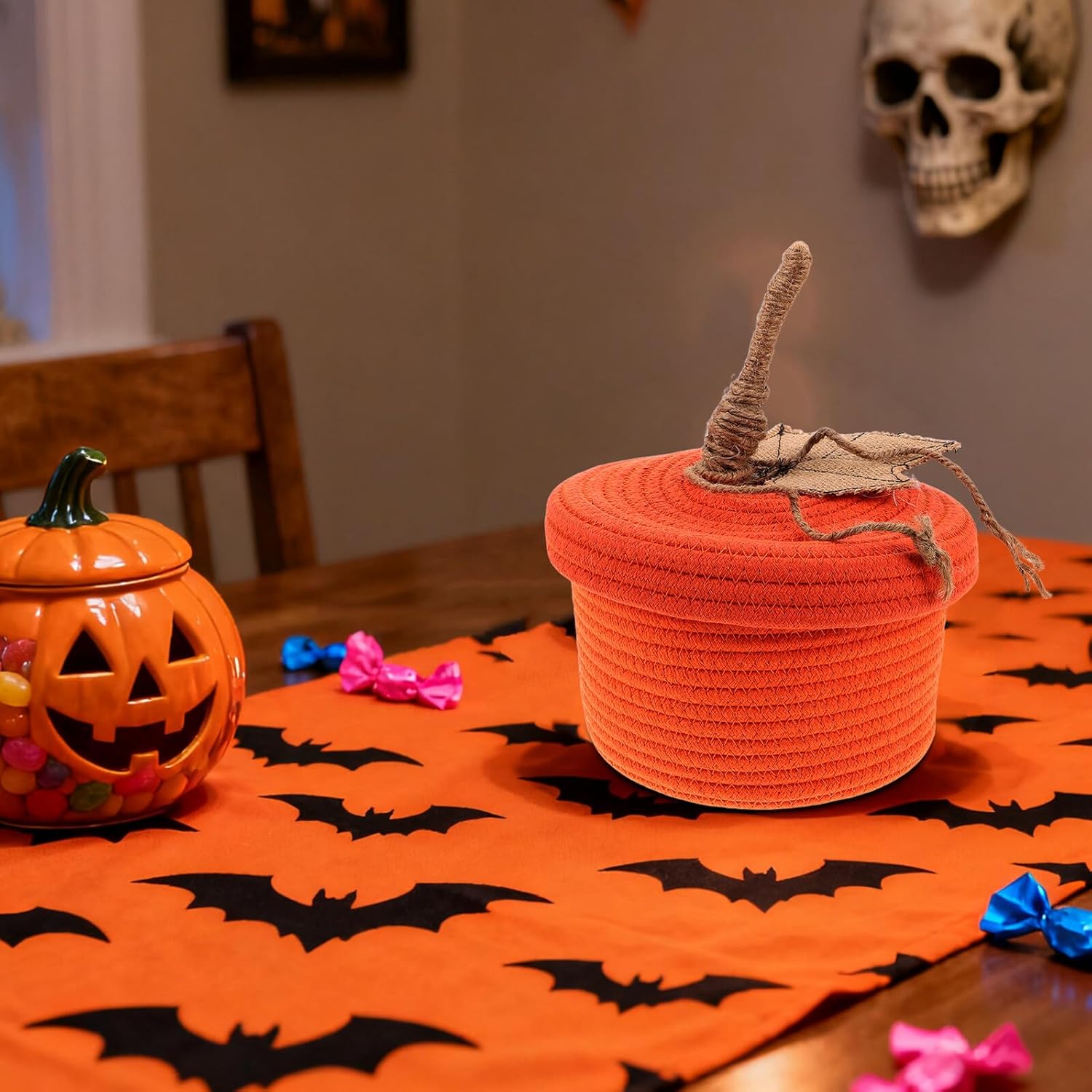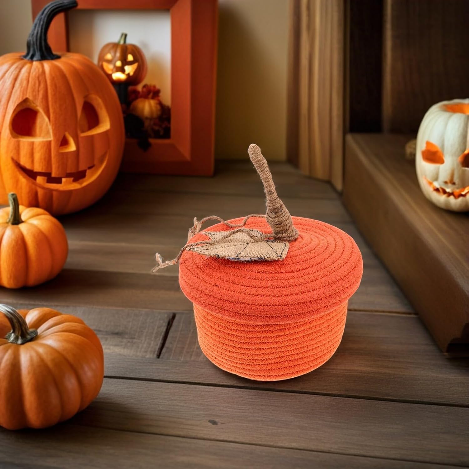 Package Include 1 x pumpkin cotton rope storage basket Characteristics -stable everyday use: constructed from thick cotton rope, this storage cotton rope storage basket withstands daily handling, for sundry storage baskets and keeping snacks secure woven storage baskets -Multiuse organizer: flexible as a bedroom sundries basket, makeup basket, or desktop organizer, the cotton rope woven basket accommodates varied storage needs across family members bedroom sundries baskets -Decor with utility: the decorative woven basket doubles as a playful ornament, providing storage woven basket benefits in a lovable pumpkin look for any desktop or shelf kitchen woven storage basket - Size: 22.00X22.00X13.00cm/8.65X8.65X5.11in -Product Info: Pumpkin cotton rope storage basket -Material:Cotton rope -Cotton rope basket: the desktop storage basket offers a neat way to store small items, makeup, and , serving as both a household snack holder and sundries organizers desktop woven storage basket -Eyecatching pumpkin shape: featuring a unique pumpkin design, this cotton rope woven desktop storage basket instantly upgrades your home accessory collection, captivating guests small snack baskets - Color: OrangeGoods Descriptiondesktop organizer baskets As a decorative woven basket and small desktop storage basket, it meets diverse family storage needs, blending seamlessly with home decorations and adding a delightful, cozy feel to any setting.desktop storage basket Create an organized space with this unique pumpkin basket, crafted from natural cotton rope to provide the cotton rope woven storage basket for desktop snacks and sundries