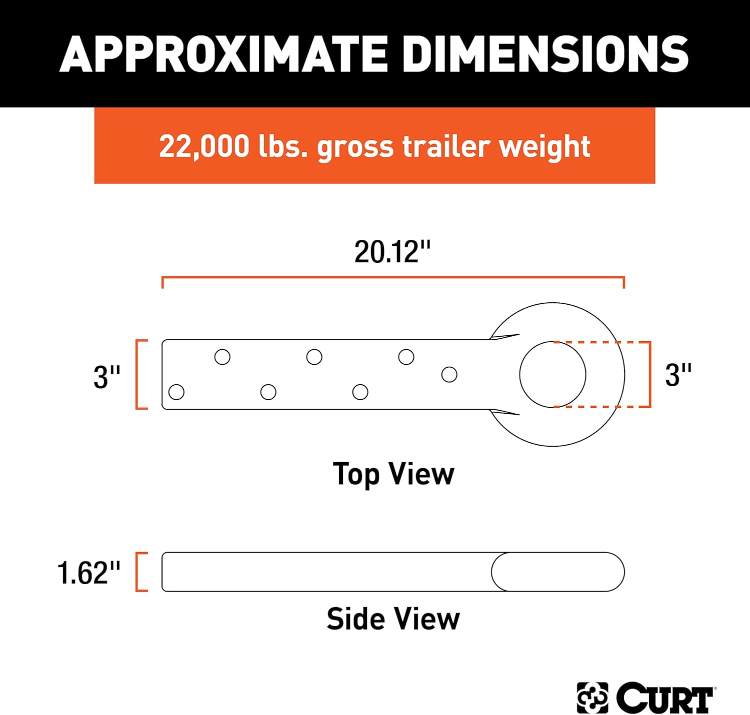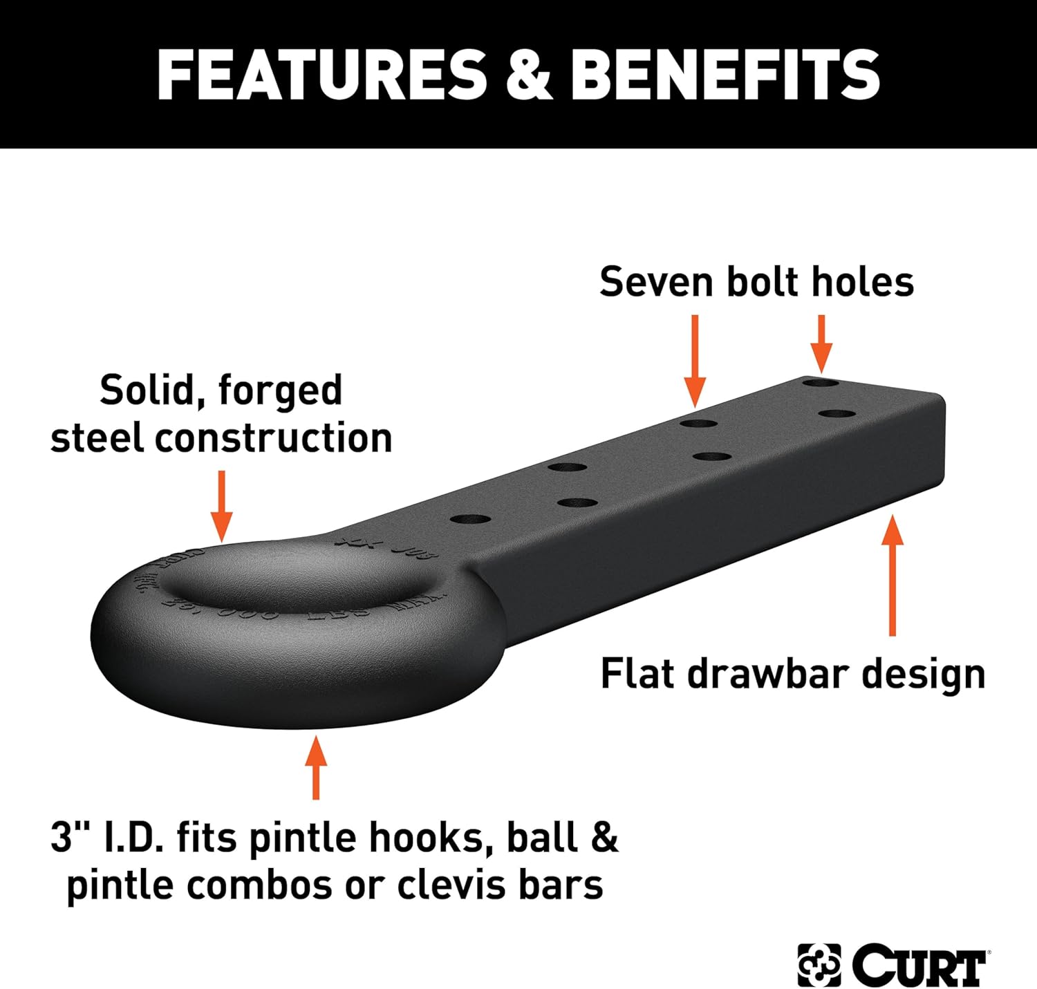In agriculture, construction and even military applications, pintle hitches are the trusted product of specialized towing. They are notorious for their high weight capacity and simple design. The basic pintle hitch is essentially a hook and loop, with the hook attached to the vehicle and the loop mounted on the trailer. Because of their simple design, pintle hitches are able to have thicker metal construction and more secure coupling. CURT has a wide variety of pintle hitches and pintle-style products to give you a complete solution for your heavy-duty towing needs. This lunette eye drawbar uses seven bolt holes to securely mount on a trailer tongue. It features a forged steel alloy construction and boasts a gross trailer weight capacity of 22,000 lbs. (NOTE: Never exceed the lowest weight capacity of any towing component; i.e. the vehicle, hitch, trailer, etc). With a 3" inside diameter, this lunette ring fits a variety of CURT pintle hooks and ball and pintle combinations. The heavyweight towing done with pintle hitches implies a certain amount of wear and tear on your towing equipment, and to prepare for this, CURT uses a quality finish on all our pintle mounts, lunette eyes and combination pintle hitches. This lunette eye is coated in a tough black powder coat finish to provide the perfect amount of rust and scratch resistance needed to face the heavy-duty towing you do every day.