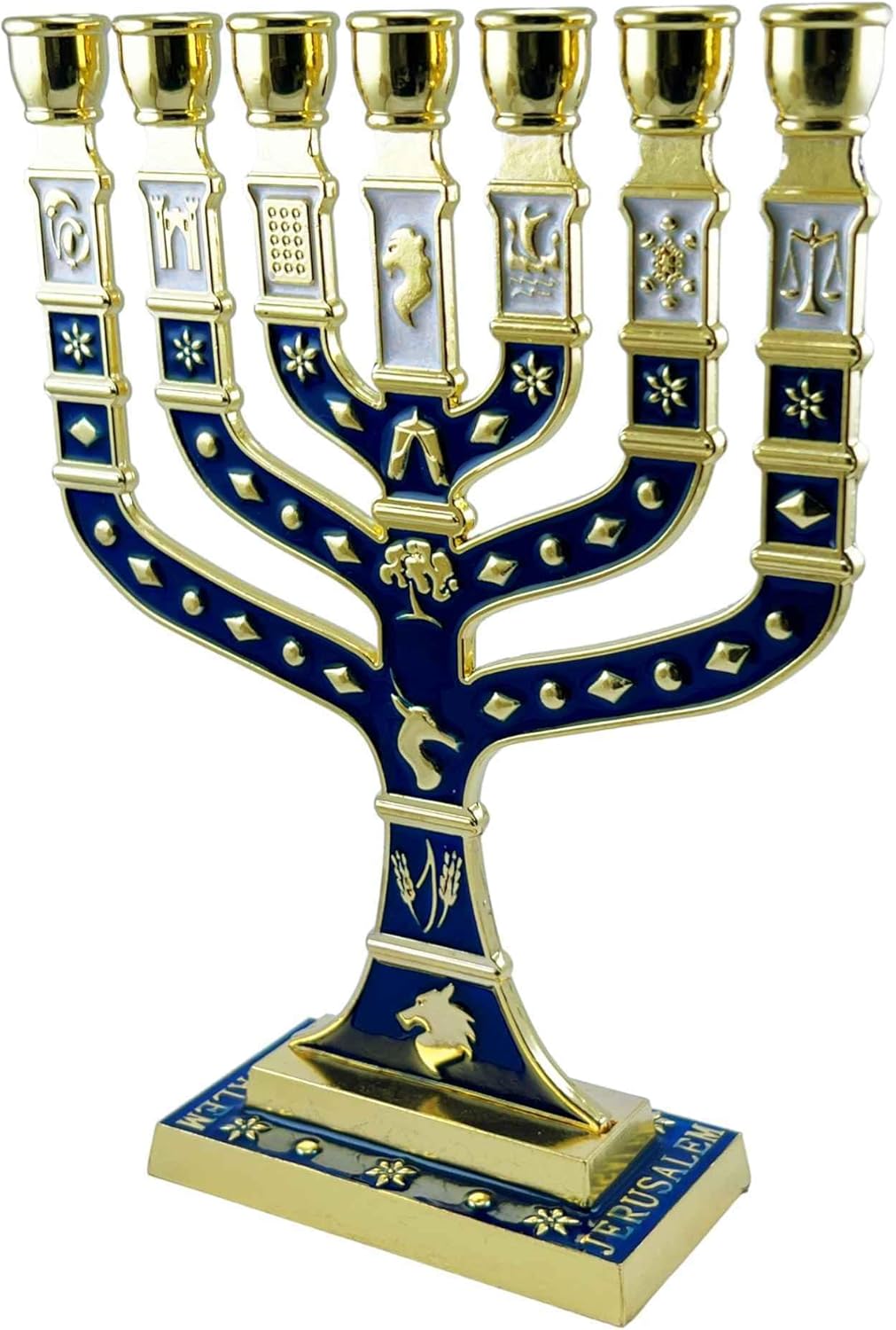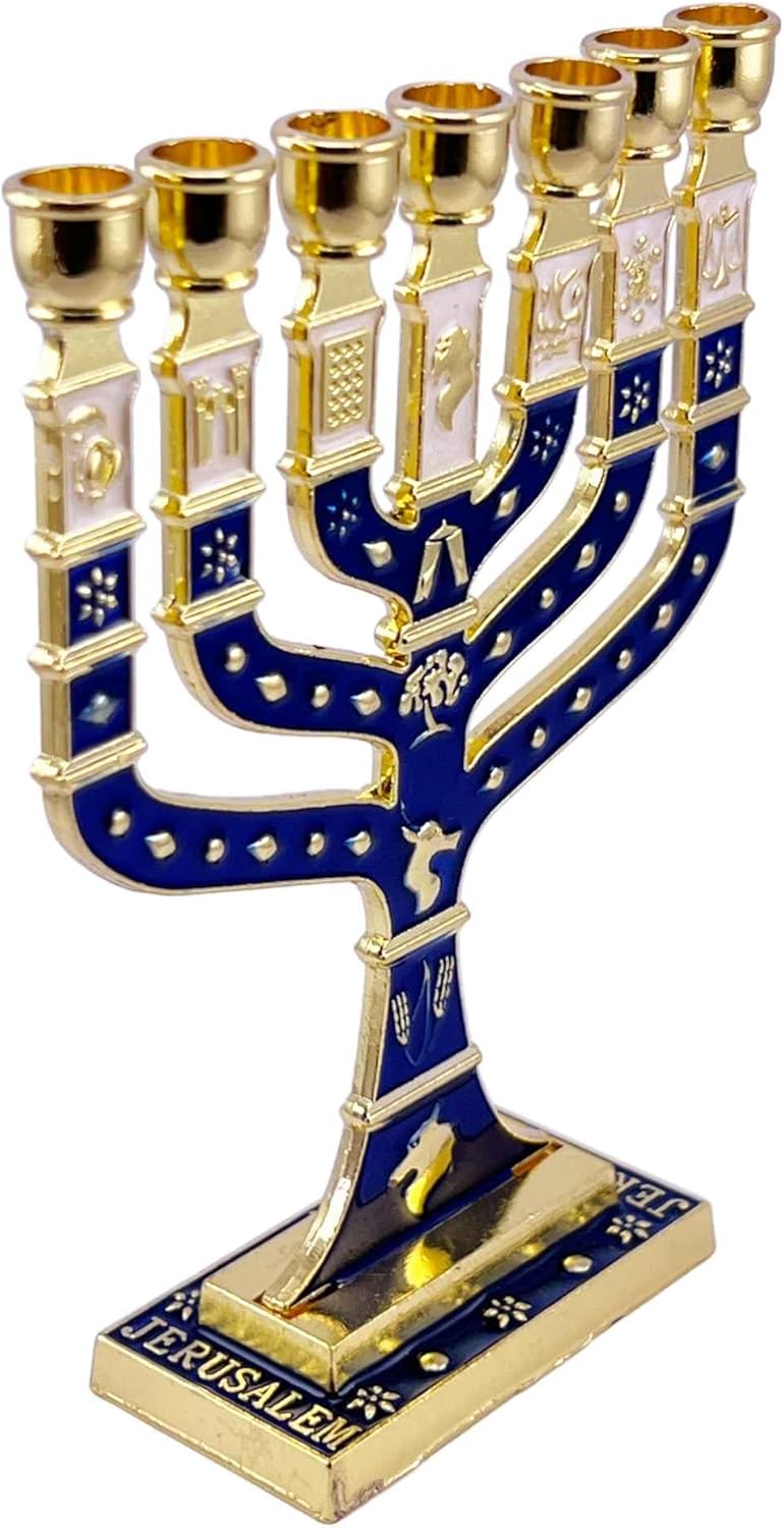 Elevate your Shabbat rituals with our Dark Blue, White & Gold Enamel Menorah 7 Branch Candle Holder, sourced from Jerusalem, Holy Land. Standing at 7 inches (18cm), this exquisite piece of Jewish home decor adds a touch of elegance to any space while honouring tradition and heritage.๐ Regal Design: Crafted with meticulous attention to detail, this Menorah features a sophisticated dark blue and gold enamel finish, exuding a sense of grandeur and reverence.๐ Symbolic Significance: Symbolizing the 12 Tribes of Israel, this Menorah serves as a powerful emblem of faith and unity, enriching your home with deep spiritual meaning.๐ฏ๏ธ Radiant Illumination: With its seven branches, each designed to hold a candle, this Menorah casts a warm and inviting glow, creating a serene ambience for your Shabbat and festive gatherings.โ๏ธ Artisanal Craftsmanship: Handcrafted in Jerusalem Holy Land by skilled artisans, this Menorah reflects centuries of Jewish tradition and craftsmanship, making it a cherished heirloom for generations to come.๐ Thoughtful Gift: Whether for a housewarming, Hanukkah, or special occasion, this Dark Blue & Gold Enamel Menorah is a meaningful and timeless gift that celebrates faith, tradition, and the beauty of Jewish heritage.Illuminate your home with the timeless elegance and spiritual significance of our Dark Blue & Gold Enamel Menorah 7 Branch Candle Holderโa cherished symbol of Jewish faith and tradition.