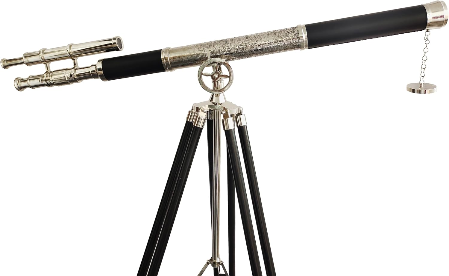 Tube Length : 39 inches, Height : 62 inches Diameter : 52mm This telescope adds a shine to any room it enters. You can present this beautiful decorative telescope to your loved ones Material used : Solid Brass and Excellent Quality Wood, Color : Black Antique Finish and Natural Wooden Crafted from solid brass, this telescope is mounted on a sturdy wooden tripod. A sturdy wooden tripod supports the telescope when standing that adds class and sophistication to any room it’s in The Brass Griffith Astro Telescope with the viewfinder is the pinnacle of our wide telescope selection. This beautiful solid brass telescope is mounted on a wooden/ Brass tripod. This telescope is a beautifully functioning nautical masterpiece, with an objective lens that produces up to 35x magnification.