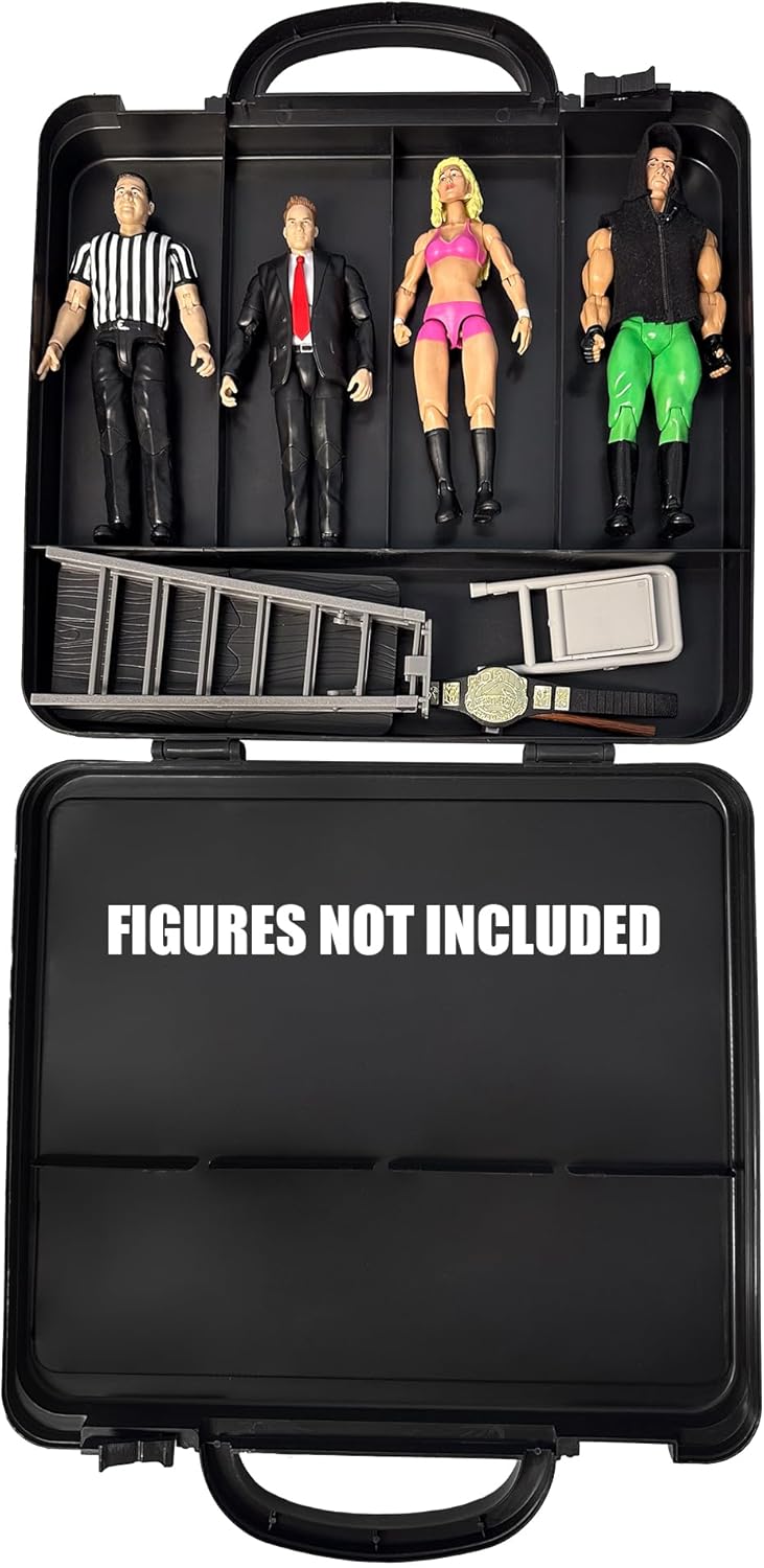 Introducing the ultimate solution for wrestling figure enthusiasts on the go – our Carrying Case for Wrestling Action Figures! This sleek and sturdy case boasts a highly detailed illustration of an intense wrestling match unfolding on the front, capturing the heart-pounding excitement of the sport. Measuring 13 inches wide, 14 inches long, and 2.5 inches tall, this case is a portable haven for your beloved action figures. Designed with precision, the interior of the case features four compartments, each measuring 3.15 inches wide and 8 inches tall, providing a secure and snug fit for your favorite wrestling action figures. But that's not all – our Carrying Case goes above and beyond with an accessory compartment, measuring 12.75 inches wide and 3.25 inches long. This compartment is perfect for storing folding chairs, tables, trash cans, and other wrestling-themed accessories, ensuring your action figures are equipped for any showdown! Includes a sledgehammer, breakable table, ladder, folding chair, and a championship figure belt to enhance your play experience. Whether you're heading to a friend's house or setting up a match in the living room, this carrying case offers both style and functionality. Elevate your wrestling figure experience and keep your prized collection organized with this must-have accessory!