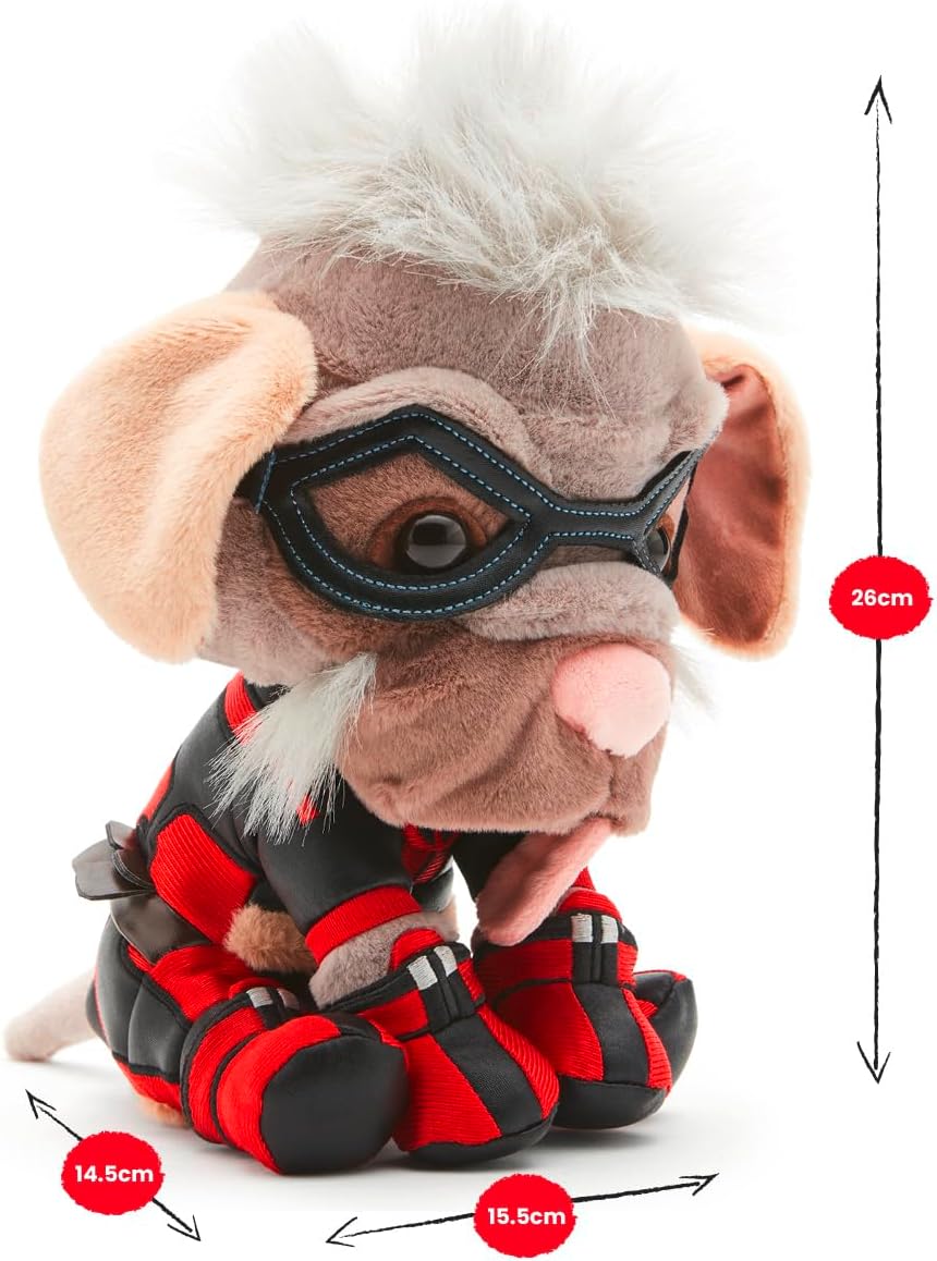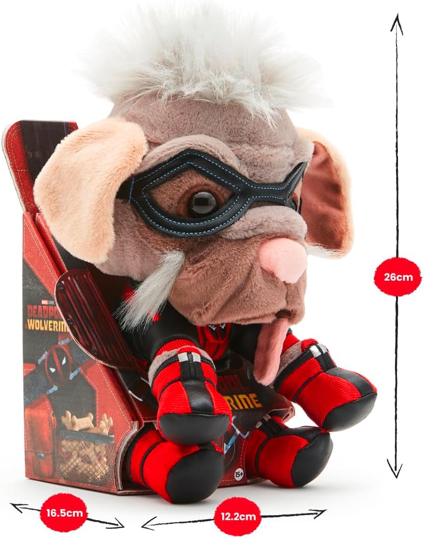 "MARVEL's DOGPOOL: MARVEL's new audience favorite in plush form In the third installment of the Deadpool film series ("Deadpool & Wolverine"), a popular comic book character enters the big screen: the member of Deadpool Corps in the form of a dog DOGPOOL! The four-legged superhero, as fearless and headstrong as Deadpool himself, quickly wins the hearts of MARVEL fans. With its 26 cm height, she includes her characteristic red and black outfit in great detail. It comes presented in a backpack shaped box to take it everywhere."