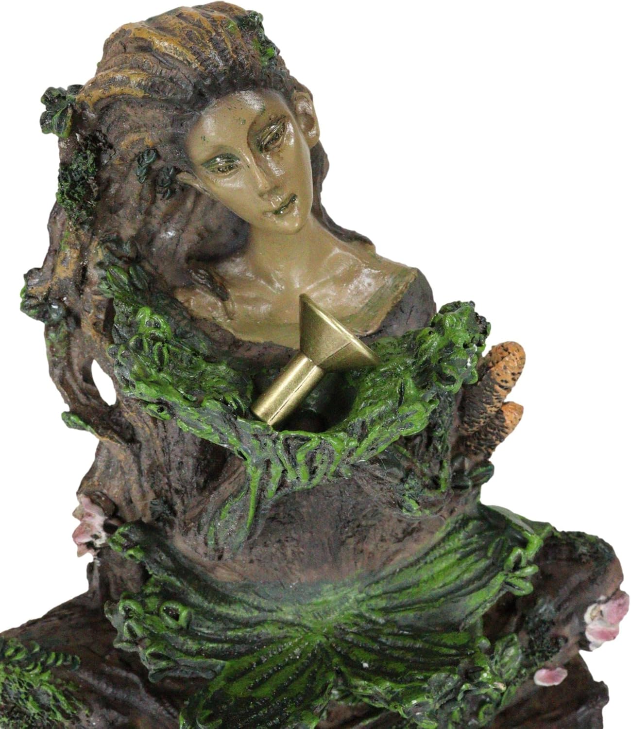 This beautiful guardian of the forest has thick networks of blossoming branches encasing her body. As she becomes one with the ancient tree trunk, her hair arms and legs begin to turn to bark, offering her humanity to the Shepherds of the Forest. In her grasp at her chest level, there is a golden dish where a small incense cone can be placed, which when lit will cascade down the wooden twists and turns of the tree trunk. The waterfall smoke will fill the basin beneath her.