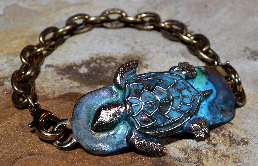 An Ocean Motif Interchangeable Rockband Bracelet with a highly detailed Sea Turtle in our one-of-a-kind coloration Verdigris Patina Solid Brass on an Interchangeable Rockband Strap of Vintage Reproduction Antiqued Gold Plate Scrollwork Chain.Interchangeable Rockband Style Bracelet, Rockband Plaque design measures 2.25 inches wide by 1 inch high. Size Medium fits Most (Total Length is 7.25 to 7.5 inches long). Elaine Coyne Galleries Artwear Collectibles are handcrafted in the USA and Includes Artist's Bio and Designer Velvet Pouch with Trademark Tag